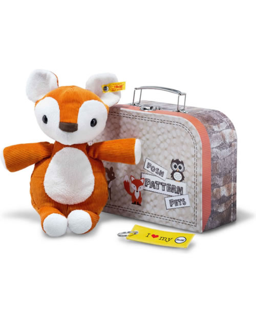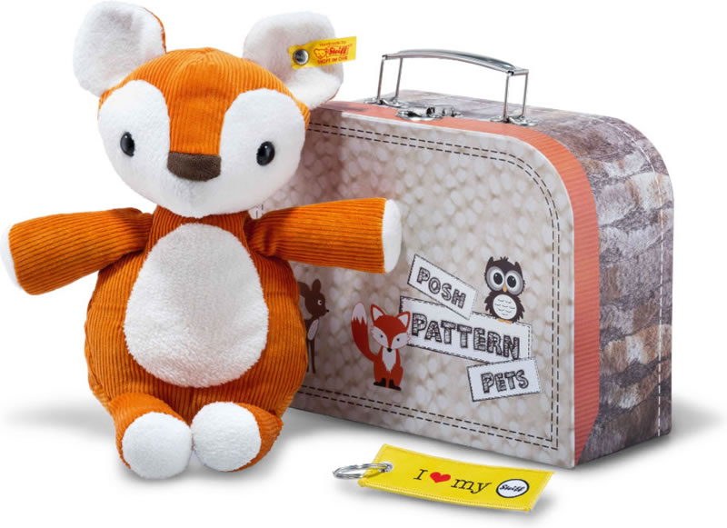 Phil Fuchs im Koffer aus der neuen Serie der Posh Pattern Pets ist 28 cm groß und mit eigenem Koffer erhältlich. Gefertigt aus hochwertiger Baumwolle, lässt dieser schlaue Fuchs den kreativen Spielideen freien Lauf. Der creme-/rostfarbene Mix aus Materialien und Mustern ist modern, genauso wie der Koffer im Trend-Design mit abnehmbarem Anhänger I LOVE MY STEIFF.