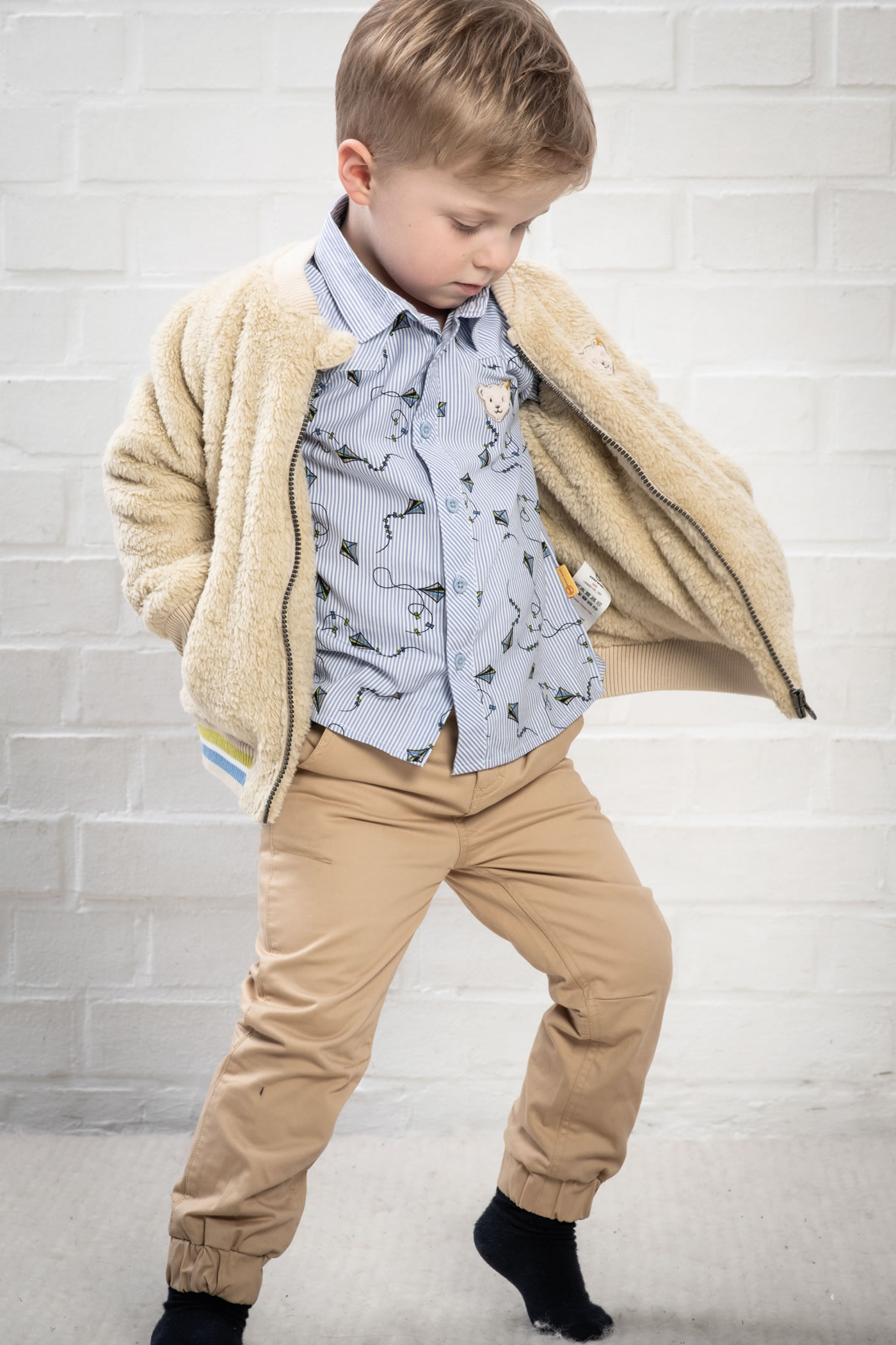 Sportlich geschnittene Cargo-Hose aus festem Baumwollstoff für Jungen aus der Classic Kollektion von STEIFF. Zwei Einstecktaschen befinden sich auf der Vorderseite und der STEIFF Bär ziert die Rückseite. Verschlossen wird die Hose mit Druckknopf und Reißverschluss. Die Weite lässt sich regulieren. Gefüttert ist die Hose mit weichem Baumwoll-Jersey.