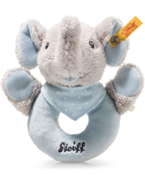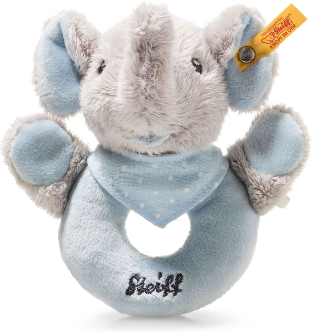 Steiff Greifring / Rassel Elefant Trampili 13 cm grau/blau
