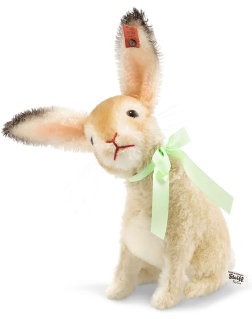 Überraschung im Osternest: Ein Griff an die Blume dieses Hasen genügt und schon – lässt er seinen hübschen Kopf kreisen. Damals begeistert diese Mechanik die Kinder; Erwachsenen entlockt sie bis heute ein freudiges Lächeln. Der Hase 1931 Replica misst zierliche 22 cm. Er ist aufwendig bemalt, mit einer Druckstimme ausgestattet, mit Holzwolle gestopft und dank Gliederdrähten durchweg stabil.