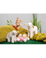 Der 24 cm große, beigefarbene Schnucki Hase hat im Steiff Atelier alles erhalten, was einen Gemütshasen auszeichnet: Die Fasern seines kuscheligen, lebendig changierenden Plüschs glänzen im Sonnenlicht. Schnauze, Innenohren und der Puschel auf dem Hasenpopo bilden Kontraste in Creme und Weiß. Dazu kommen Airbrush-Akzente an Mund, Nase, Augenwinkeln und Ohren. Seine Vorderpfoten schmiegen sich sanft aneinander und formen für alle Fälle ein gemütliches Kissen.
