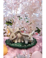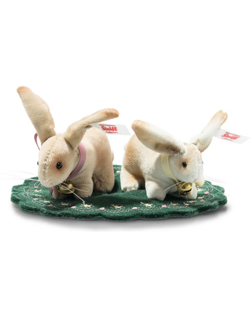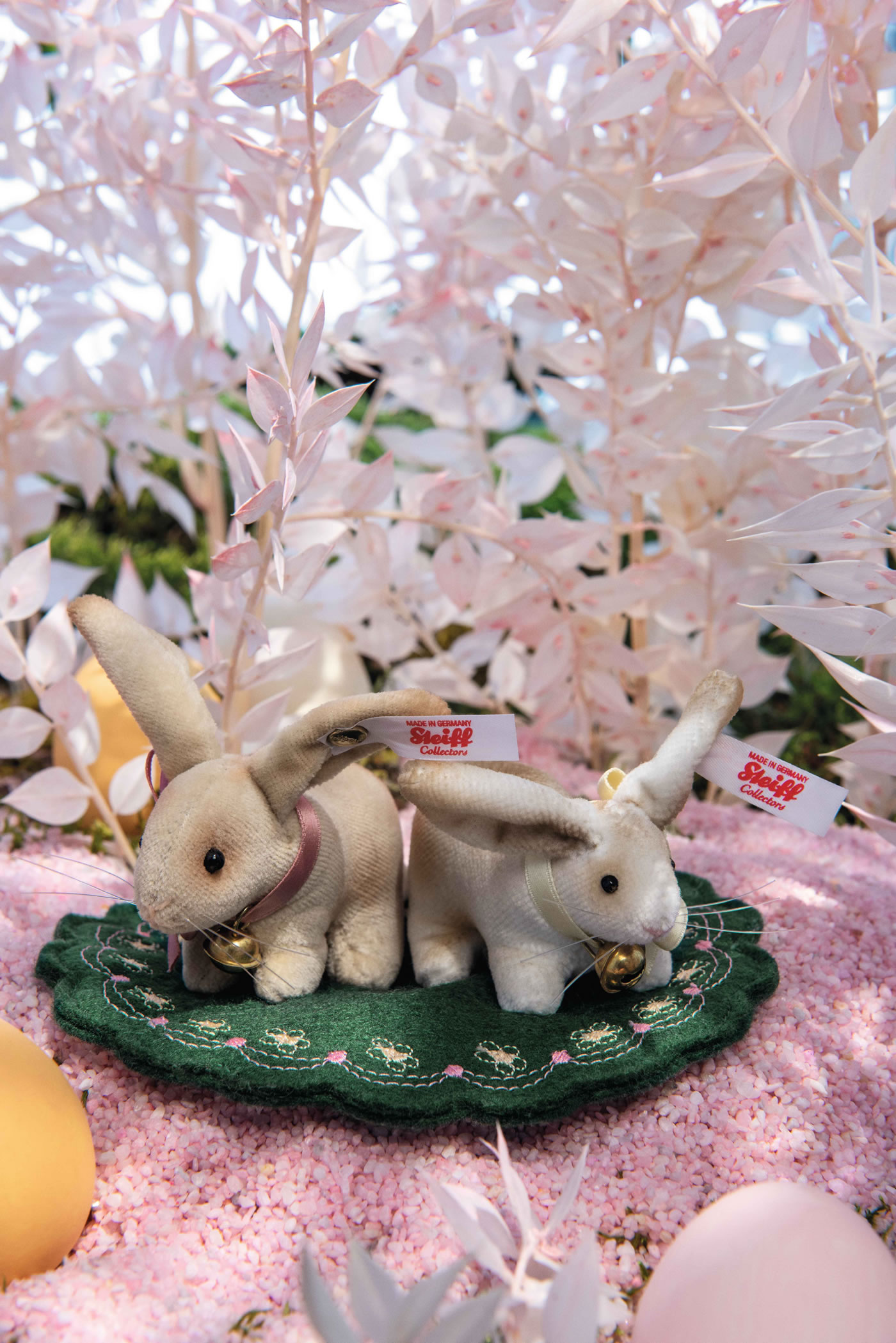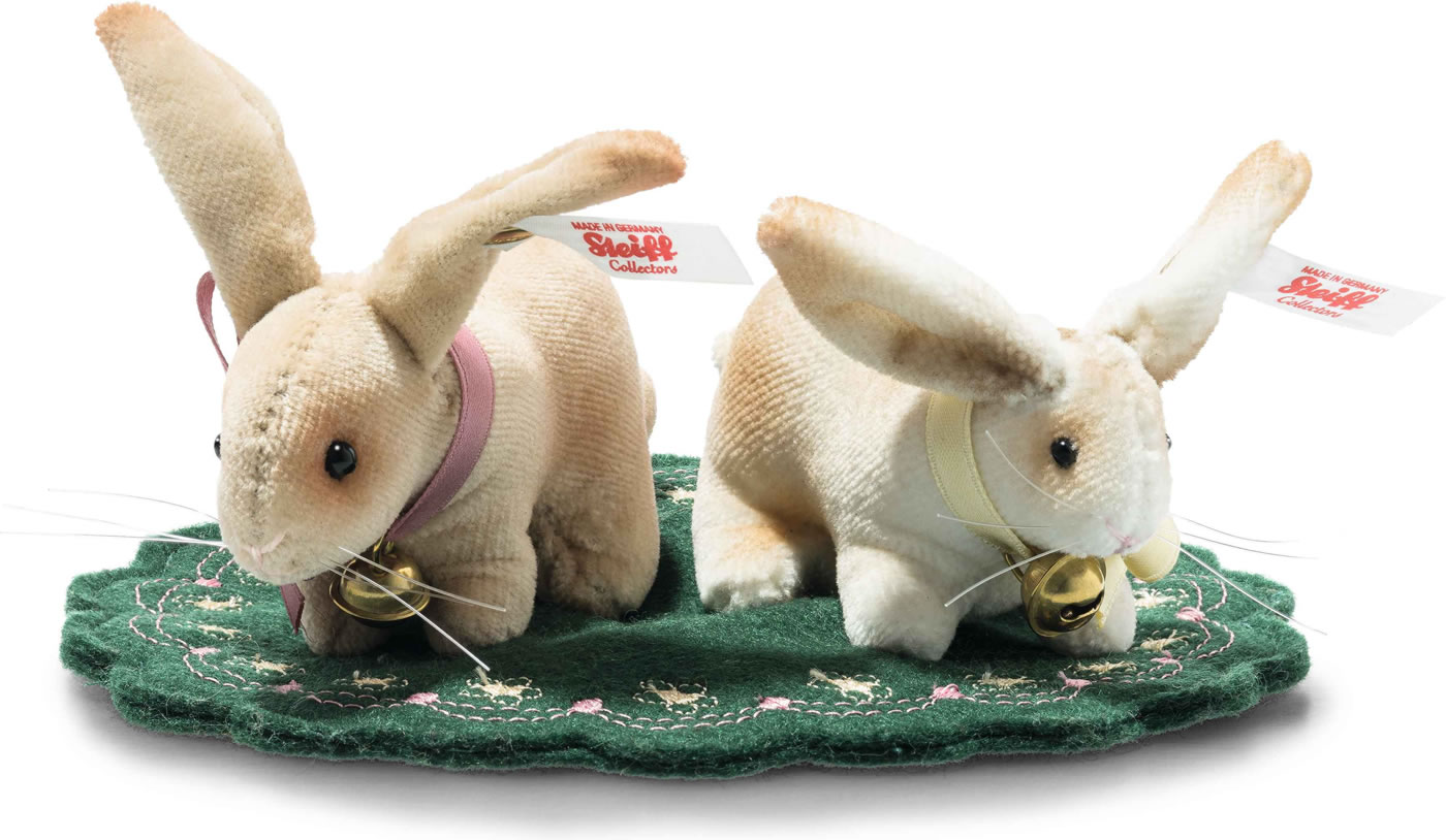 Diese beiden Hasen aus Baumwollsamt sitzen auf einer bestickten Filzunterlage, die an die Anfänge des Unternehmens erinnert – das erste Kuscheltier der Welt von Margarete Steiff war ein Nadelkissen aus Filz in Form eines kleinen Elefanten, das ebenfalls auf einer Filzunterlage befestigt war. Die beiden kleinen Kaninchen haben den klassischen Stil und das Design von Steiff Samtkaninchen aus dem späten 19. Jahrhundert.