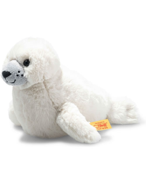 Der 20 cm große Soft Cuddly Friends Aro Heuler ist ein stolzes, nach Steiff Manier gearbeitetes Robbenbaby aus weichem, strahlend weißem Plüsch mit kurzfloriger grauer Schnauze. Seine tiefschwarze Nase, sein Mund und die charakteristischen Schnurrhaare sind gestickt. Ein kurzes Abstützen mit den Seitenflossen, dann schwimmt er weiter, den Edelstahl „Knopf im Ohr“ an der linken Flosse. Granulatsäckchen im unteren Bauchbereich und seine Schwanzflosse halten Aro Heuler auf Kurs.