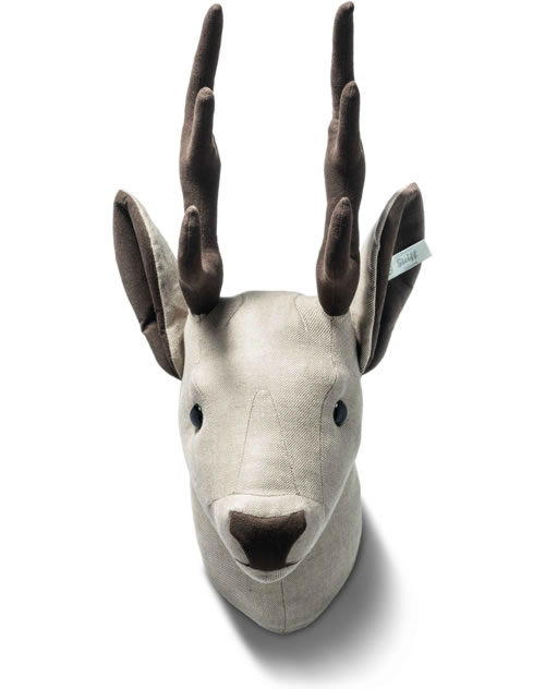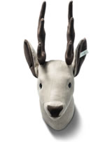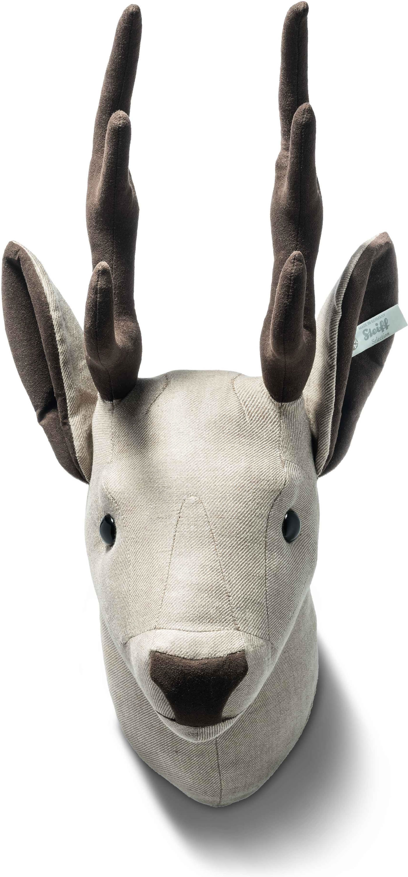 Der 35 cm große hellbraune Best of Selection Hirschkopf ist mit reinem Leinen in Hellgrau bezogen, die Nahtführung unterstützt sein ausdrucksvolles Gesicht. Geweih, Innenohren und Nase sind in Alcantara gearbeitet. Er ist eine Neuauflage des im Jahr 2012 rasch vergriffenen Selection Hirschkopfs aus Wollstoff. Die Selection Ohrfahne und ein Kristall-„Knopf im Ohr“ aus der Reihe „Kristalle von Swarovski®“ unterstreichen den edlen Look des neuen Steiff Interior Artikels.