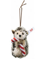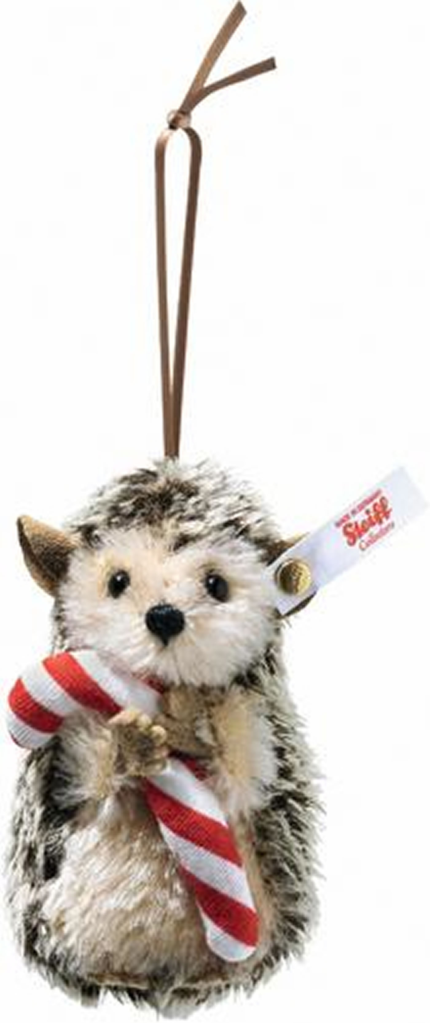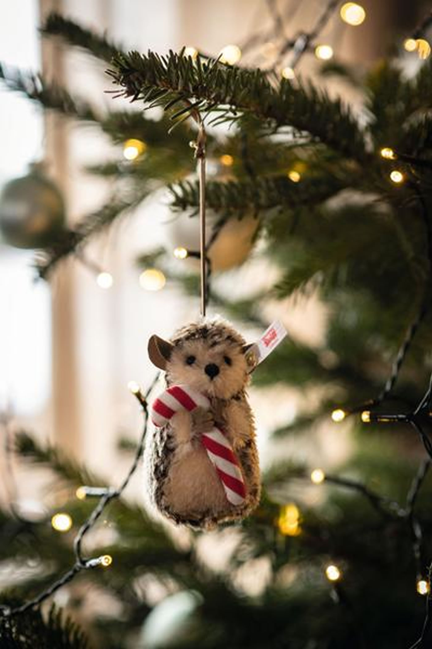 Steiff hat eine Reihe von Anhängern für den Tannenbaum entwickelt. Dieser Igel mit einer Zuckerstange in den Pfötchen ist ein besonders niedliches Exemplar. Fast zum Anknabbern süß.