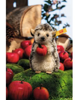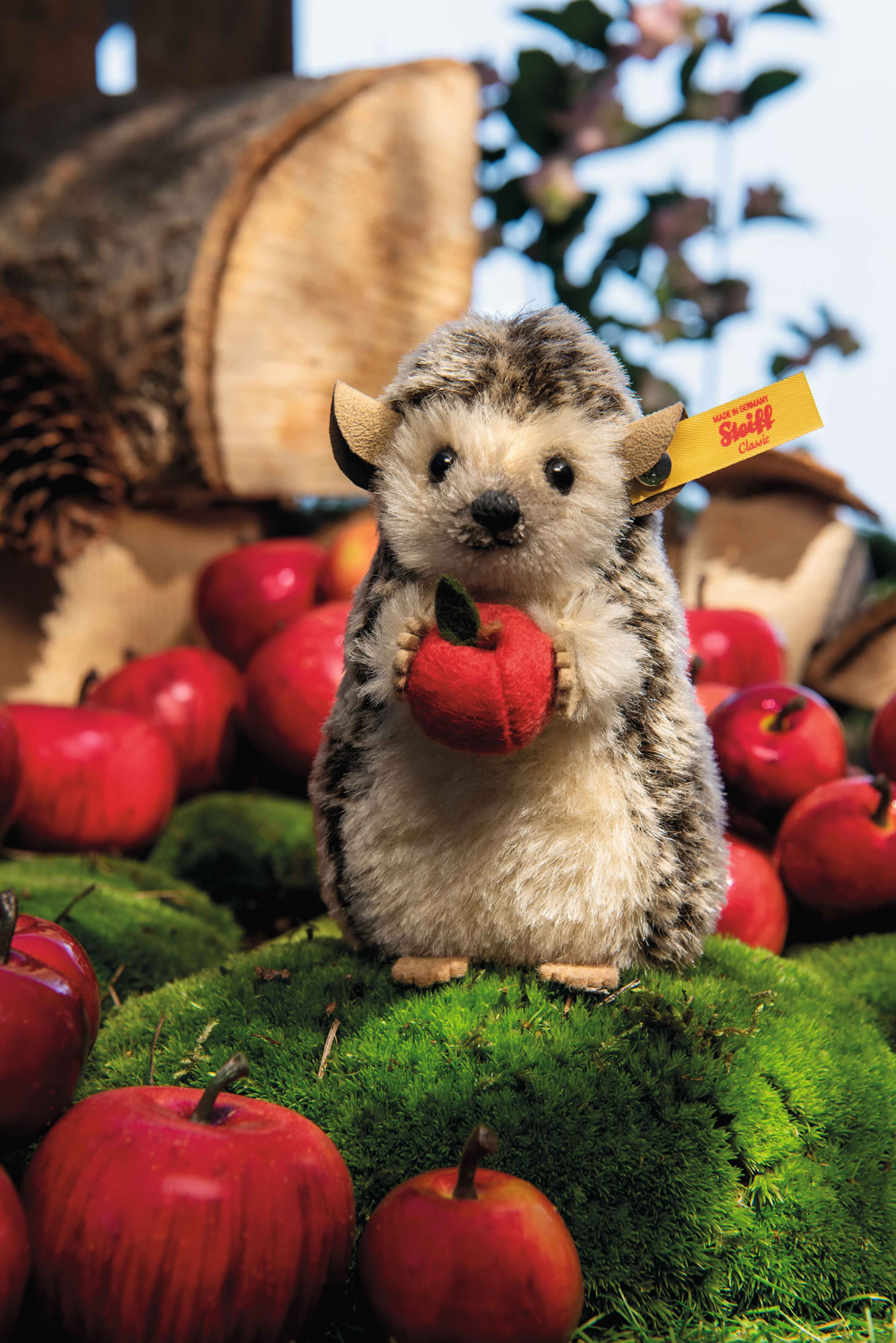 Den 11 cm großen, aufwartenden Ivo Igel haben wir aus feinstem Mohair in Braun und Beige genäht. Sein Rückenkleid zeigt – wie natürliche Igelstacheln auch – einen Farbverlauf von hell bis zu fast schwarz. Das herzförmige Igelgesicht mit der spitzen, handgestickten Nase und den glänzenden Augen ist mit Airbrush schattiert. Seine kleinen Klappohren, Hände und Füße sind wie der Apfel in Filz gearbeitet, ein Edelstahl „Knopf im Ohr“ ziert das linke Ohr.