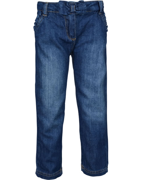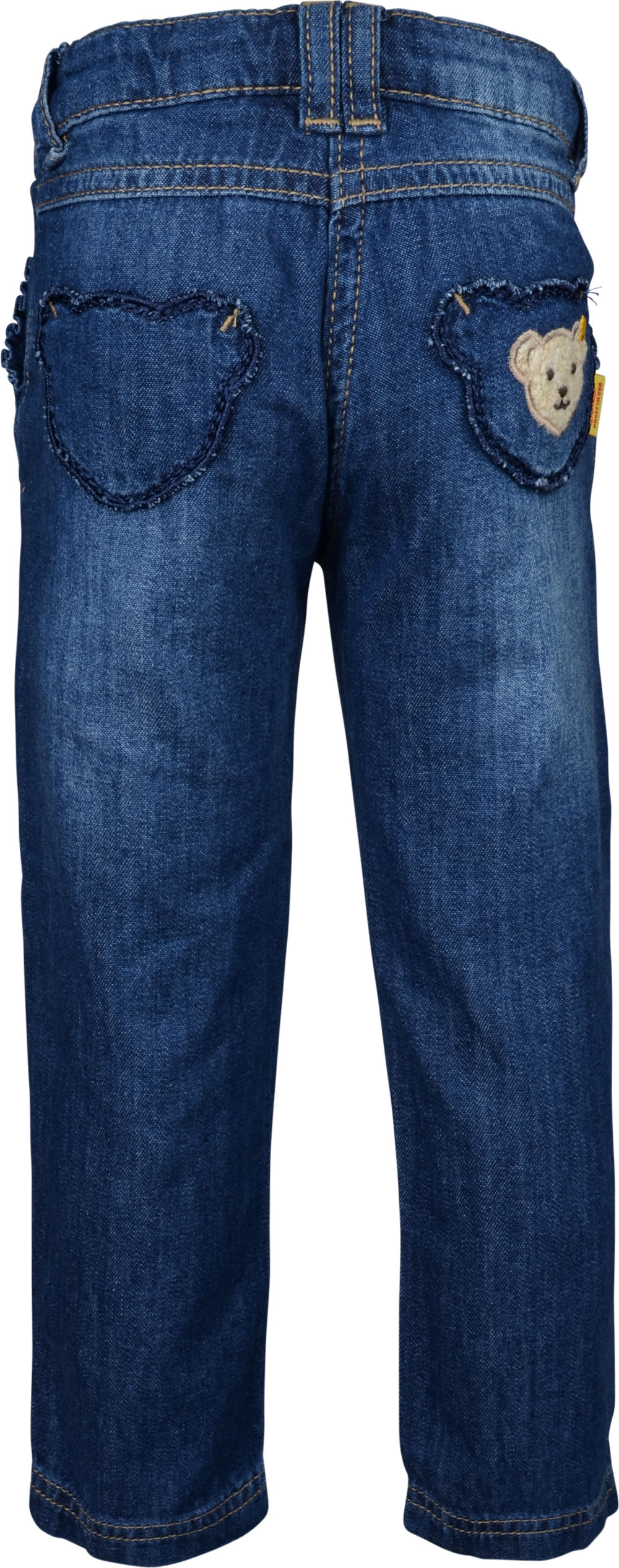 Geradegeschnittene Jeanshose in light blue denim aus der aktuellen Wildflowers-Kollektion für Mädchen von STEIFF. Auf der Rückseite befindet sich der kleine STEIFF Bär. Die Taschen sind mit einer feinen Rüschenborte verziert. Am Druckknopf-Verschluss befindet sich eine Schleife. Auf der Innenseite ist die Hose mit einem Gummizug ausgestattet, so kann die Weite individuell reguliert werden.