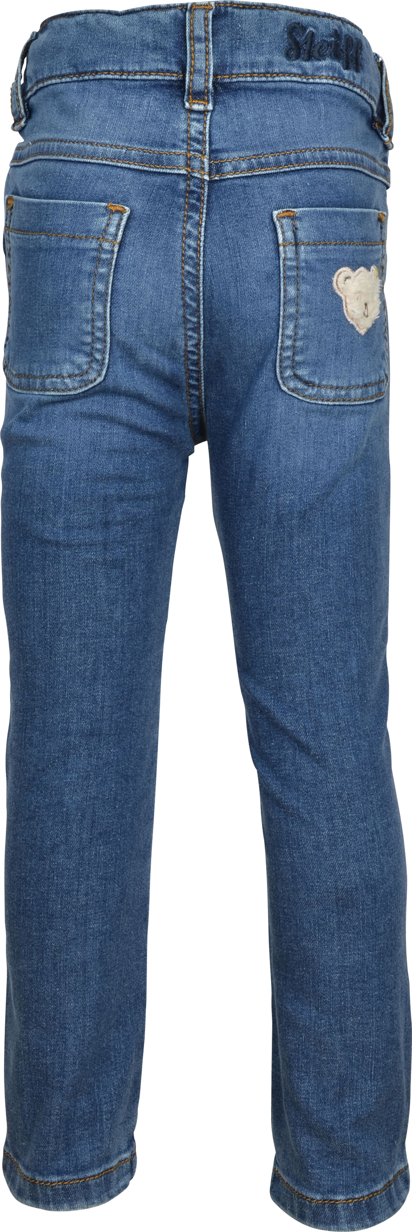 Leichte Jeans für Mädchen aus der Sweet Cherry-Kollektion von STEIFF. Zwei Einstecktaschen befinden sich auf der Vorderseite und zwei Taschen auf der Rückseite, auf der sich auch der kleine STEIFF Bär befindet. Der Hakenverschluss erleichtert das An- und Ausziehen und der verstellbare Gummibund sorgt für ein gutes Tragegefühl.