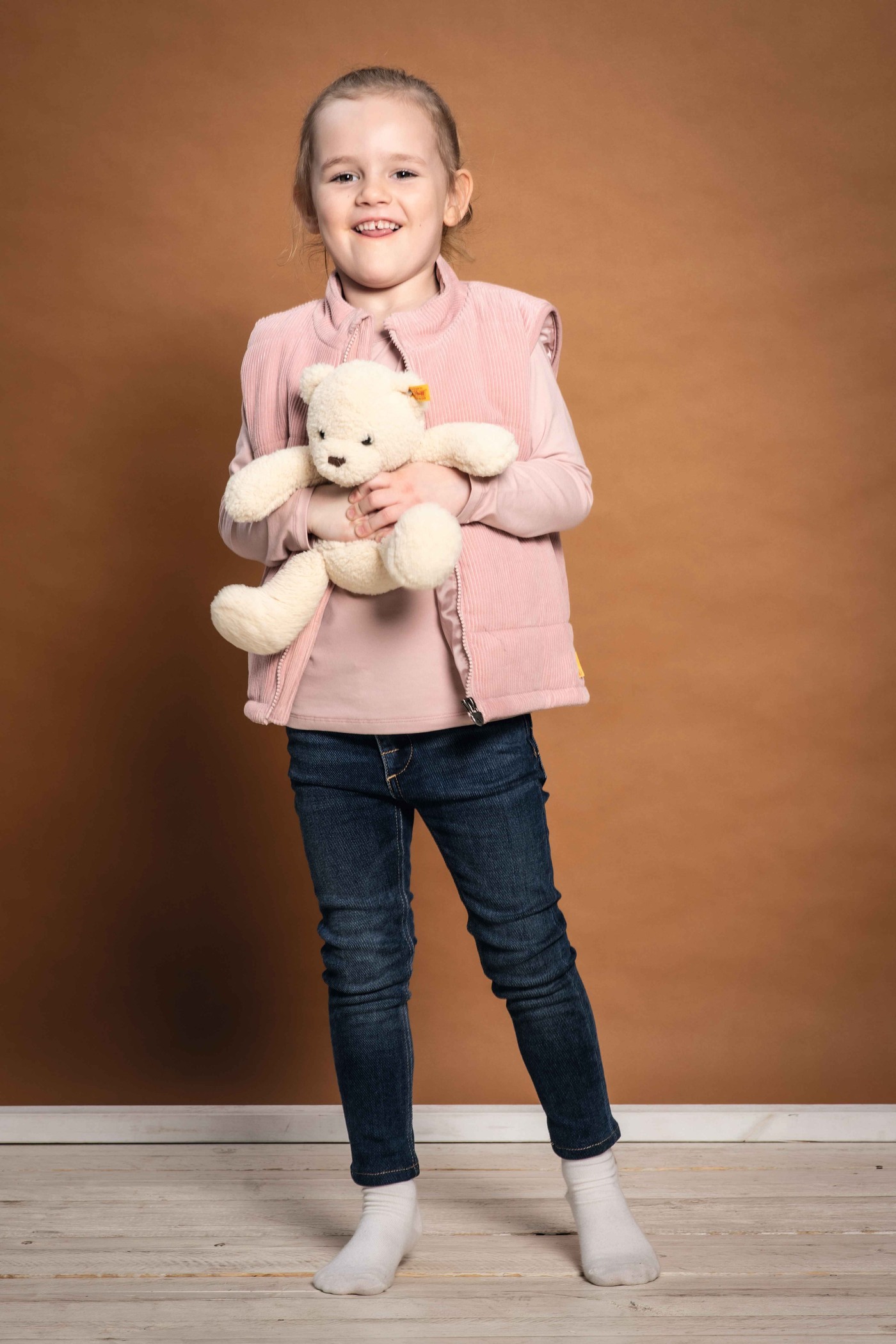Vorn und hinten befinden sich zwei Taschen für Kleinigkeiten. Das STEIFF Logo ziert die Vorderseite. Verschlossen wird die Hose mit Druckknopf und Reißverschluss.