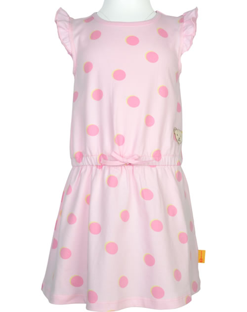 Sommer-Kleid Mit Flügelärmelnvon STEIFF aus der Garden Party Kollektion. Das Kleid ist aus Baumwolljersey und ideal für die heißen Tage. Das Bündchen in der Taille sorgt für einen guten Sitz. Besonders schön sind die zarten Tupfen und der STEIFF Bär auf der Vorderseite.