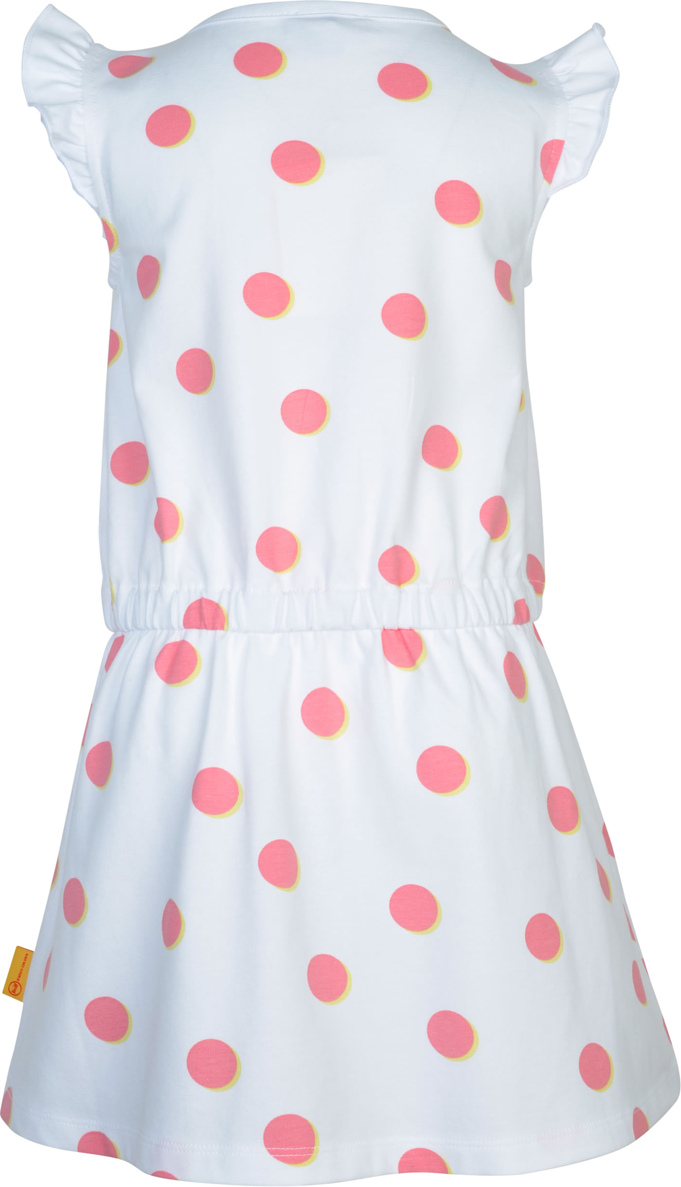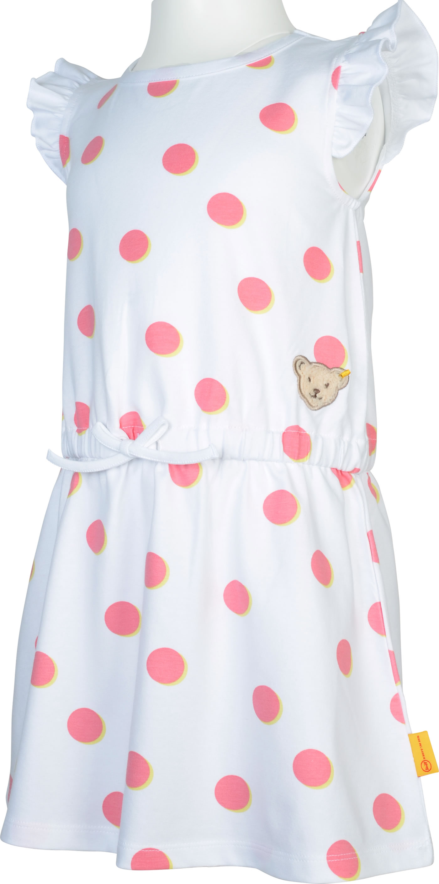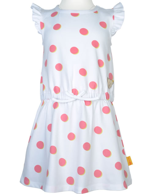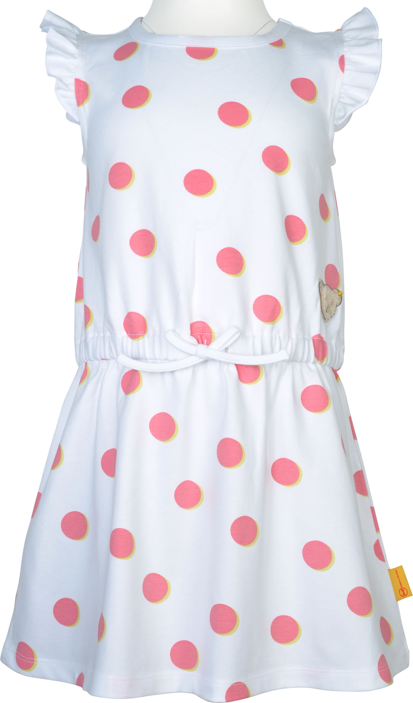 Sommer-Kleid Mit Flügelärmelnvon STEIFF aus der Garden Party Kollektion. Das Kleid ist aus Baumwolljersey und ideal für die heißen Tage. Das Bündchen in der Taille sorgt für einen guten Sitz. Besonders schön sind die zarten Tupfen und der STEIFF Bär auf der Vorderseite.