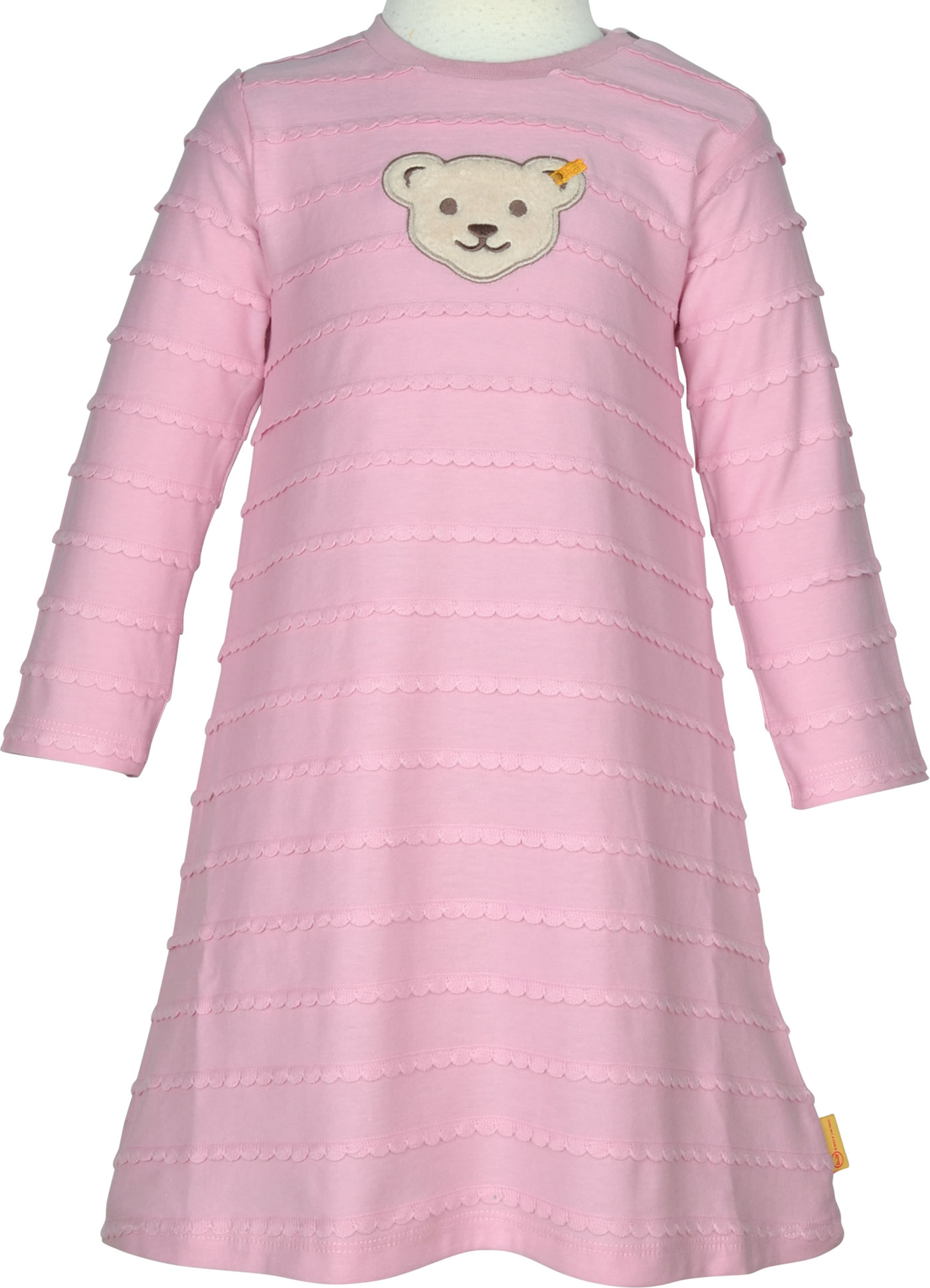 Schönes und bequemes Jersey-Kleid für Mädchen aus der Sweet Heart-Kollektion von STEIFF. Das Kleid ist in A-Linie geschnitten. Besonders schön sind das Wellenmuster und der STEIFF Bär auf der Brust. Zwei Druckknöpe erleichtern das An- und Ausziehen.