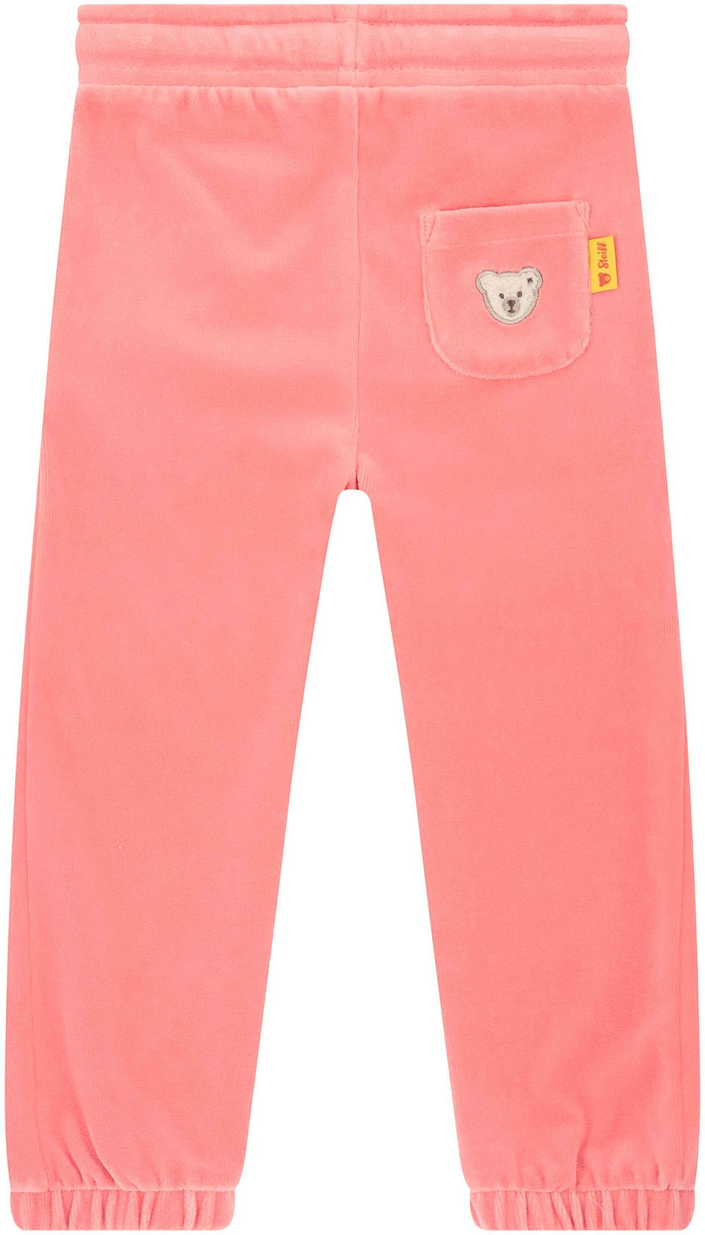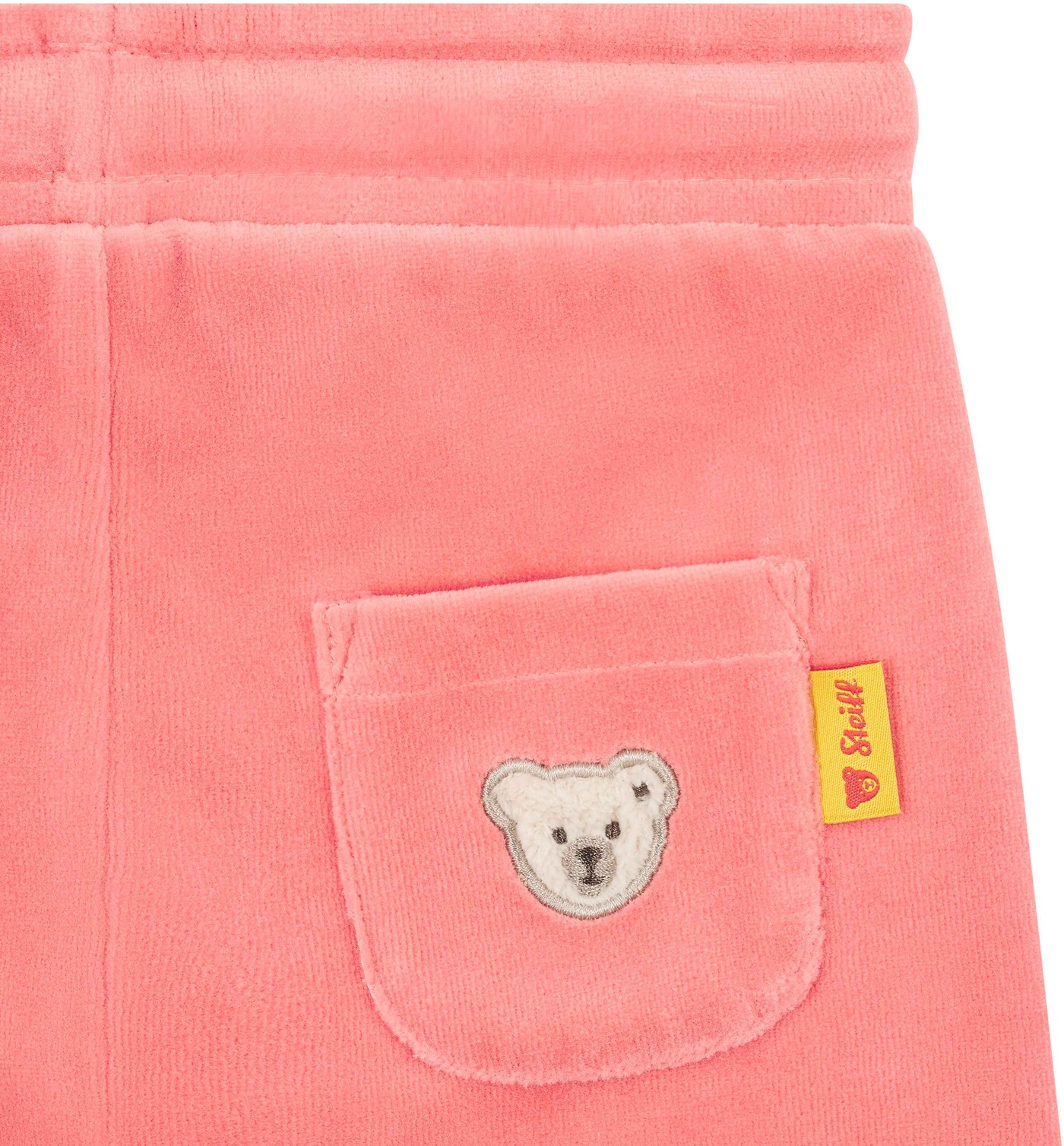 Zwei schräge Eingrifftaschen bieten Platz für kleine Schätze, und eine aufgesetzte Gesäßtasche mit dem neuen und modernen Steiff Teddybärmotiv setzt einen liebevollen Markenakzent.🧸