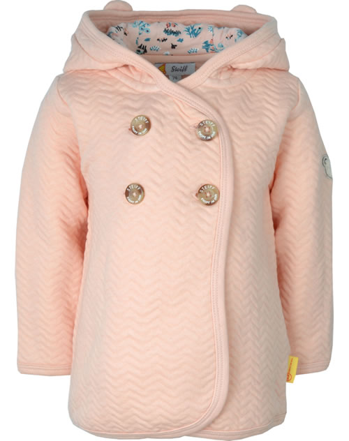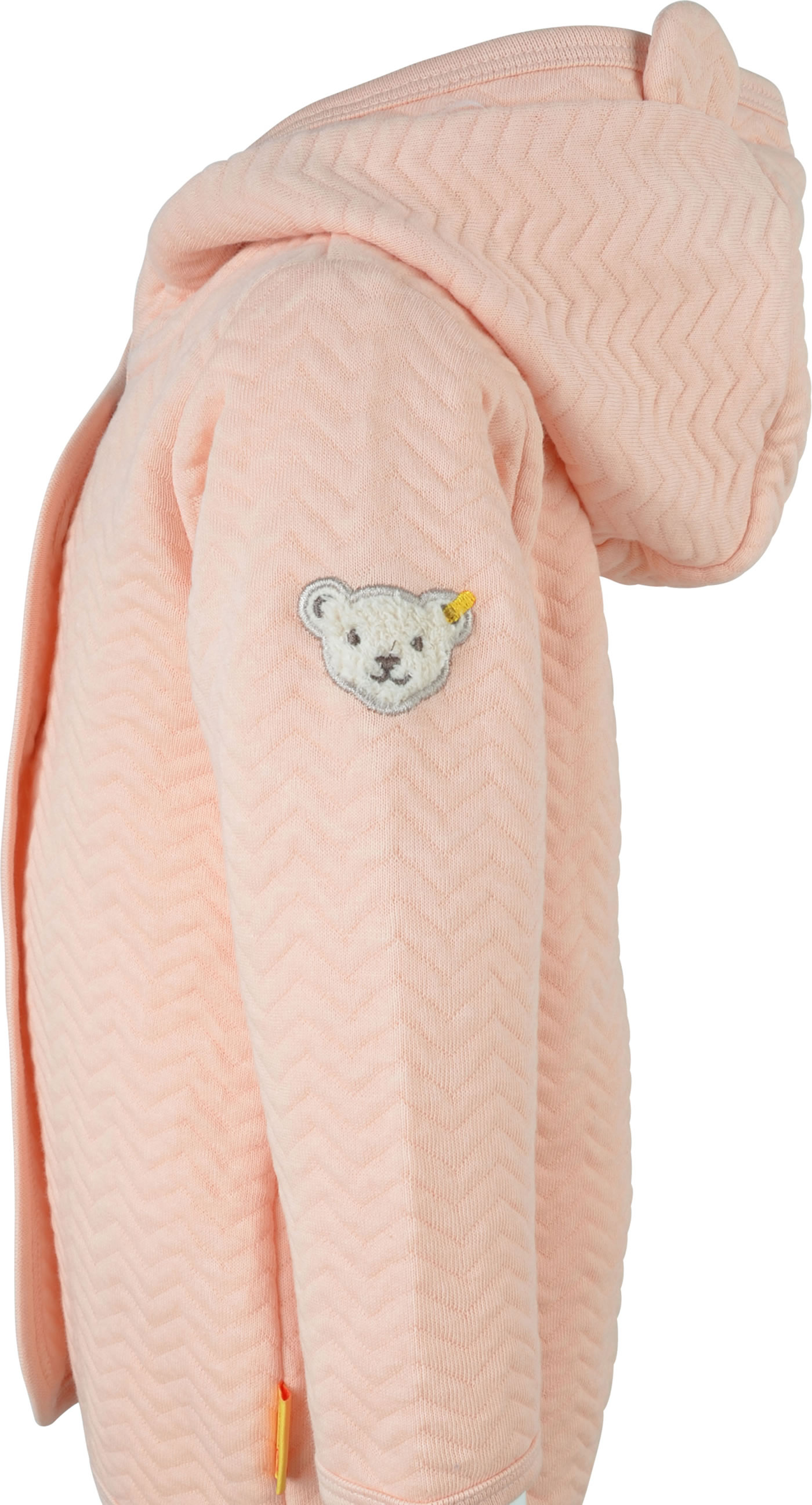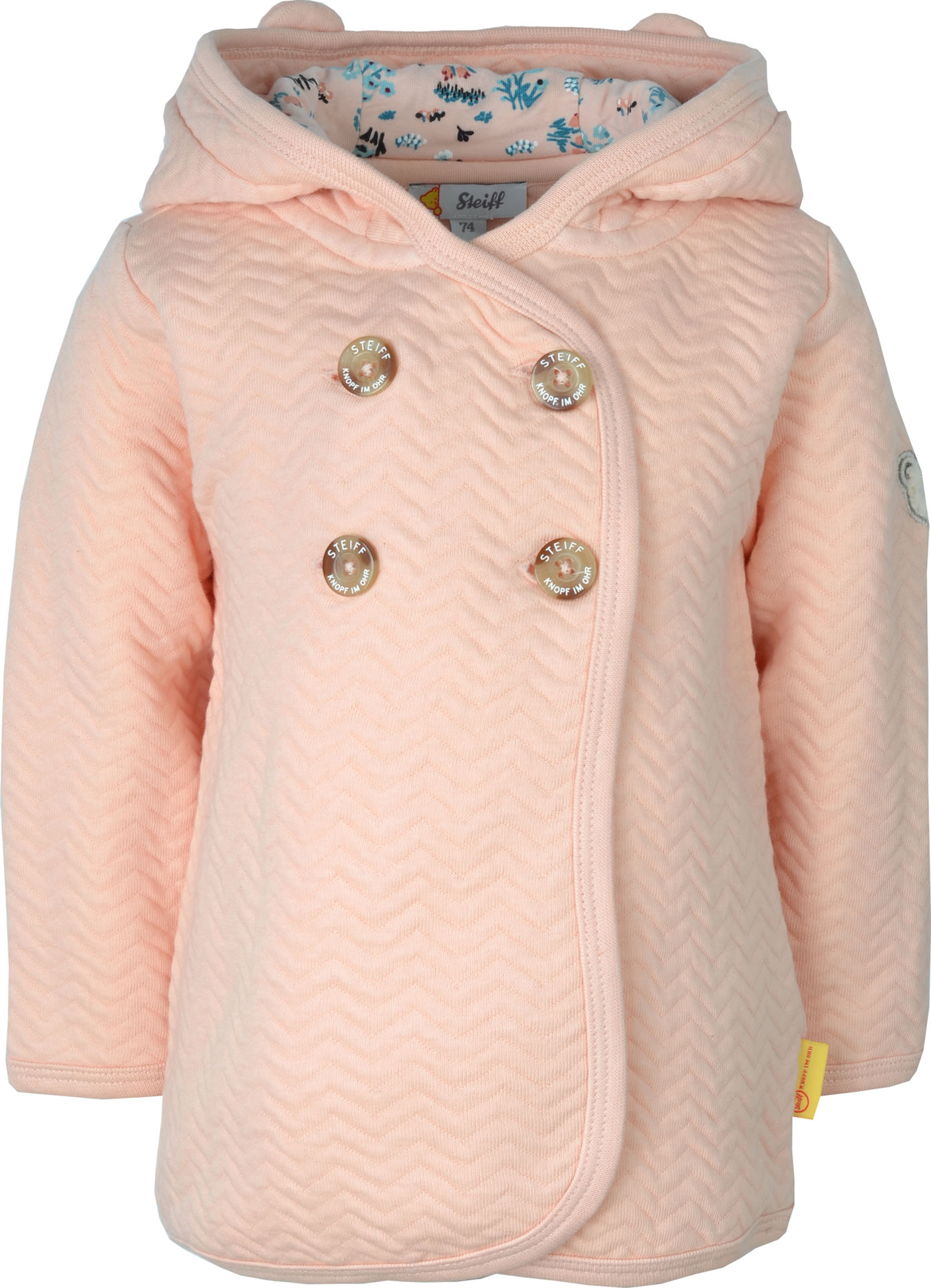 Sweatjacke mit Kapuze für Mädchen aus der Bird's Twittering-Kollektion von STEIFF Die Jacke wird mit einer doppelreihigen Knopfleiste verschlossen. Der weiche Stoff mit Wellenmuster sorgt für einen hohen Tragekomfort. Besonders schön sind das geblümte Kapuzenfutter und die Bärenohren an der Kapuze. Der kleine STEIFF Bär ziert den linken Ärmel.