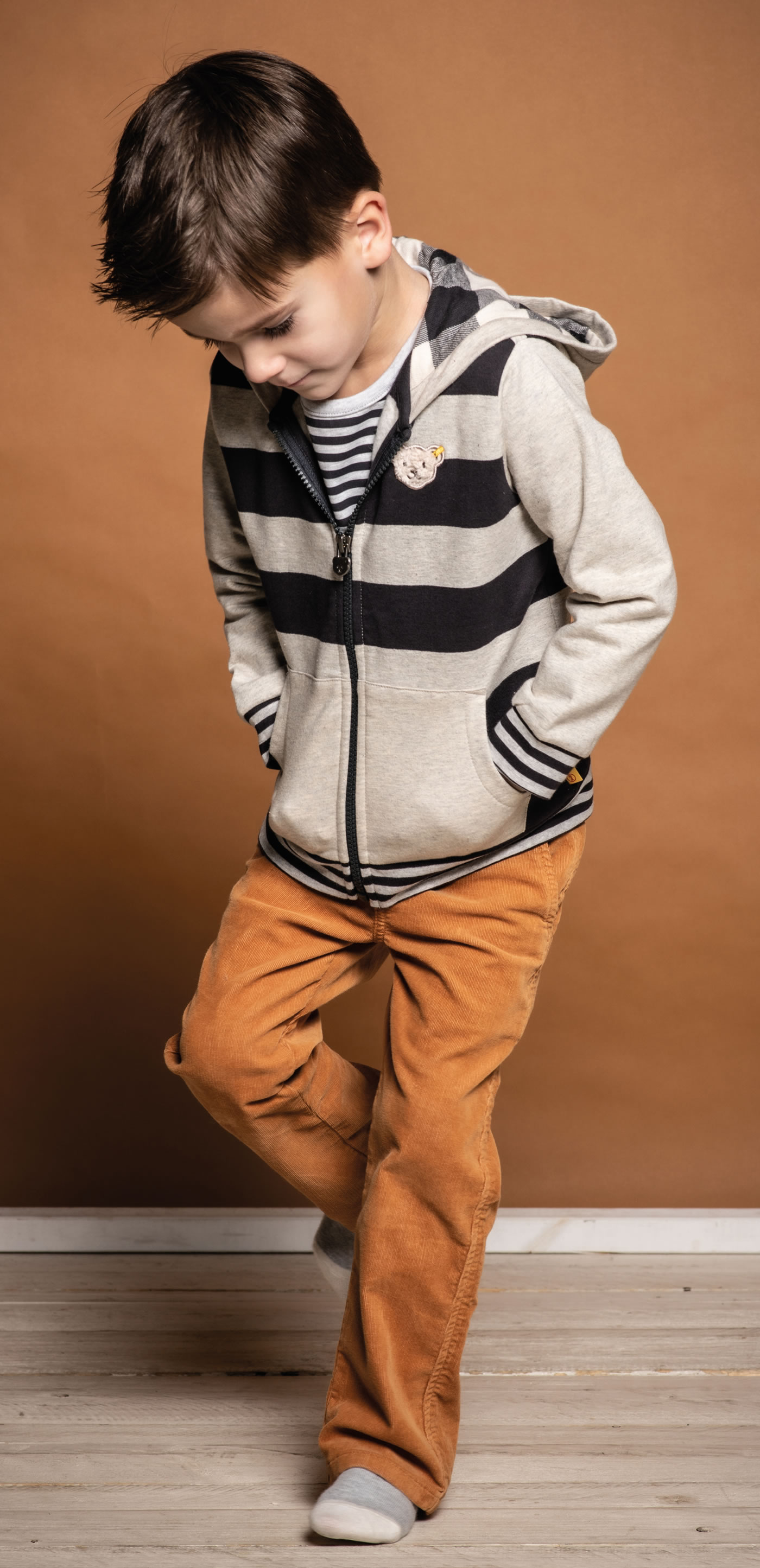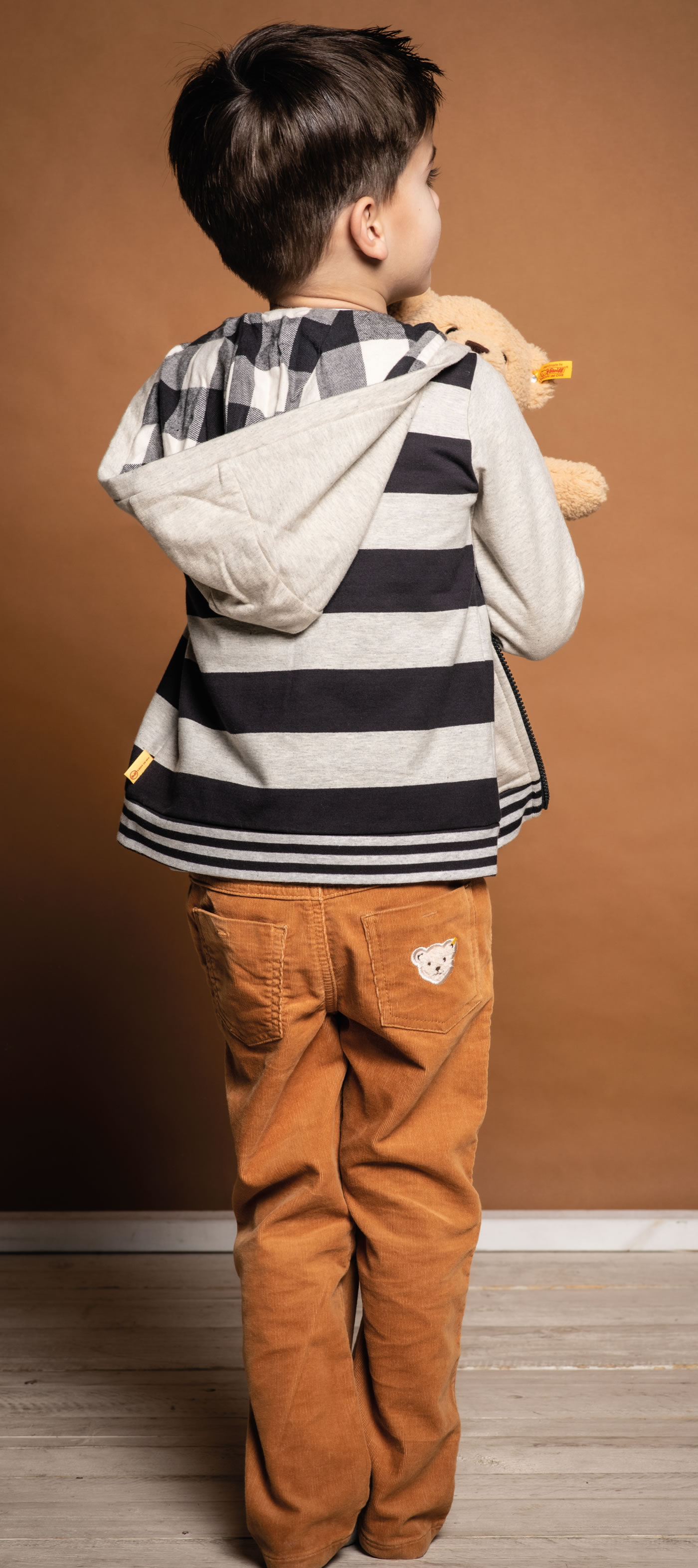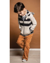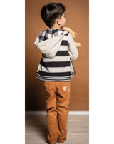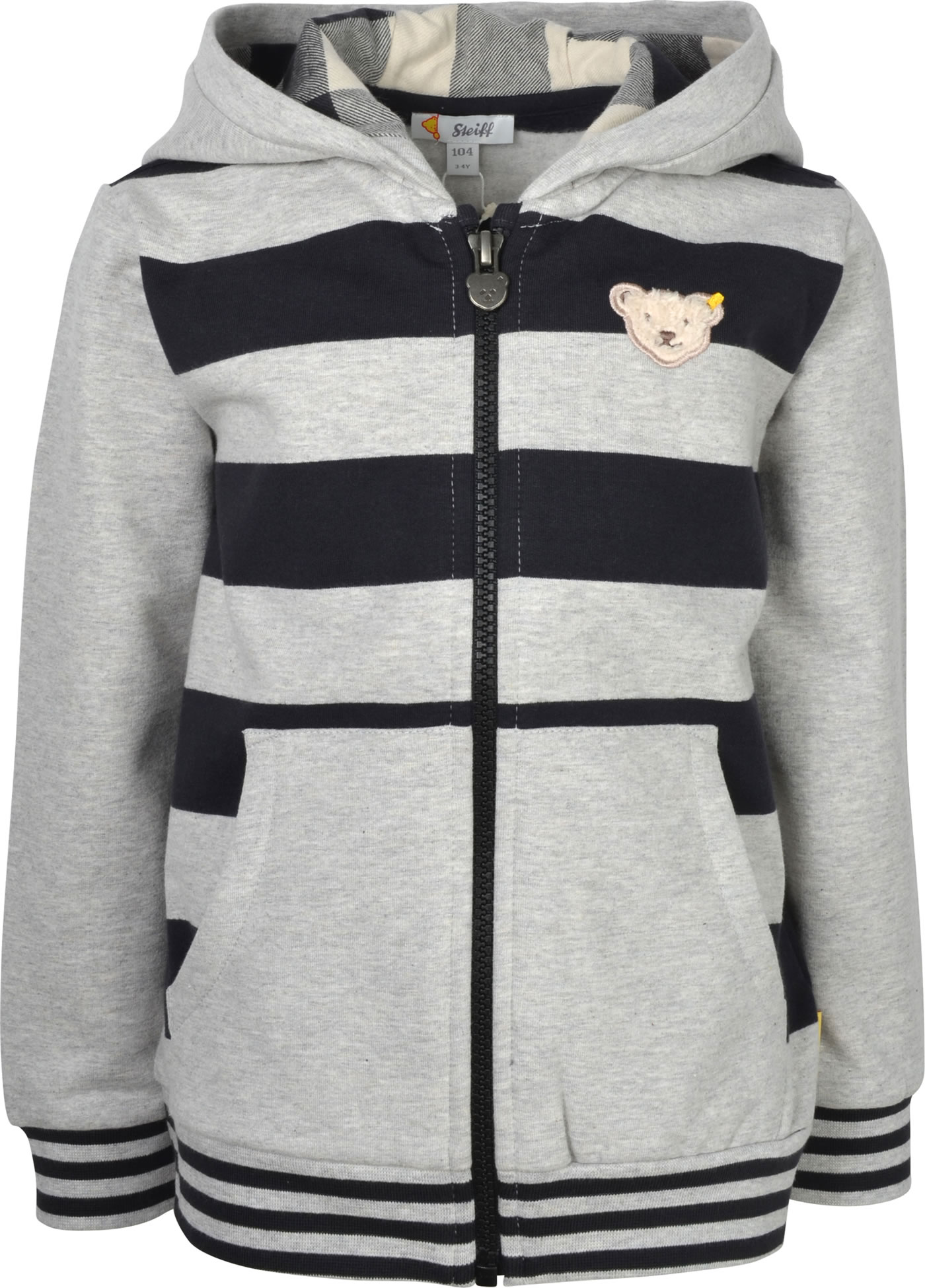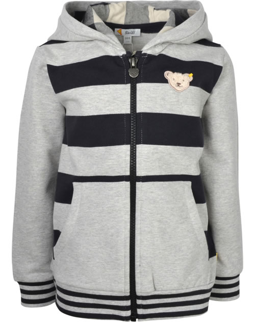 Gestreifte Sweatjacke mit Kapuze für Jungen aus der Red Panda-Kollektion von STEIFF Die Jacke wird mit einem Reißverschluss verschlossen. Die Jacke ist aus Sweatstoff und die Kapuze ist mit weichem Jersey gefüttert. Die Innenseite ist weich angeraut. Der STEIFF Bär ziert die Brust und zwei Einstecktaschen bieten Platz für Kleinigkeiten.