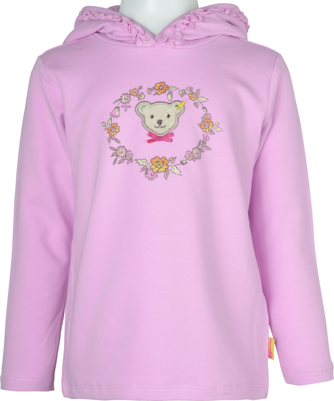 Sweatshirt mit Kapuze für Mädchen aus der Best Friends-Kollektion von STEIFF. Innen ist das Sweatshirt weich angeraut und bietet dadurch einen hohen Tragekomfort. Besonders schön ist der Print mit Blumen und dem kleinen STEIFF Bären in der Mitte. Ein besonders schönes Detail sind die Rüschen an der Kapuze. Die Rückseite ist etwas länger geschnitten.