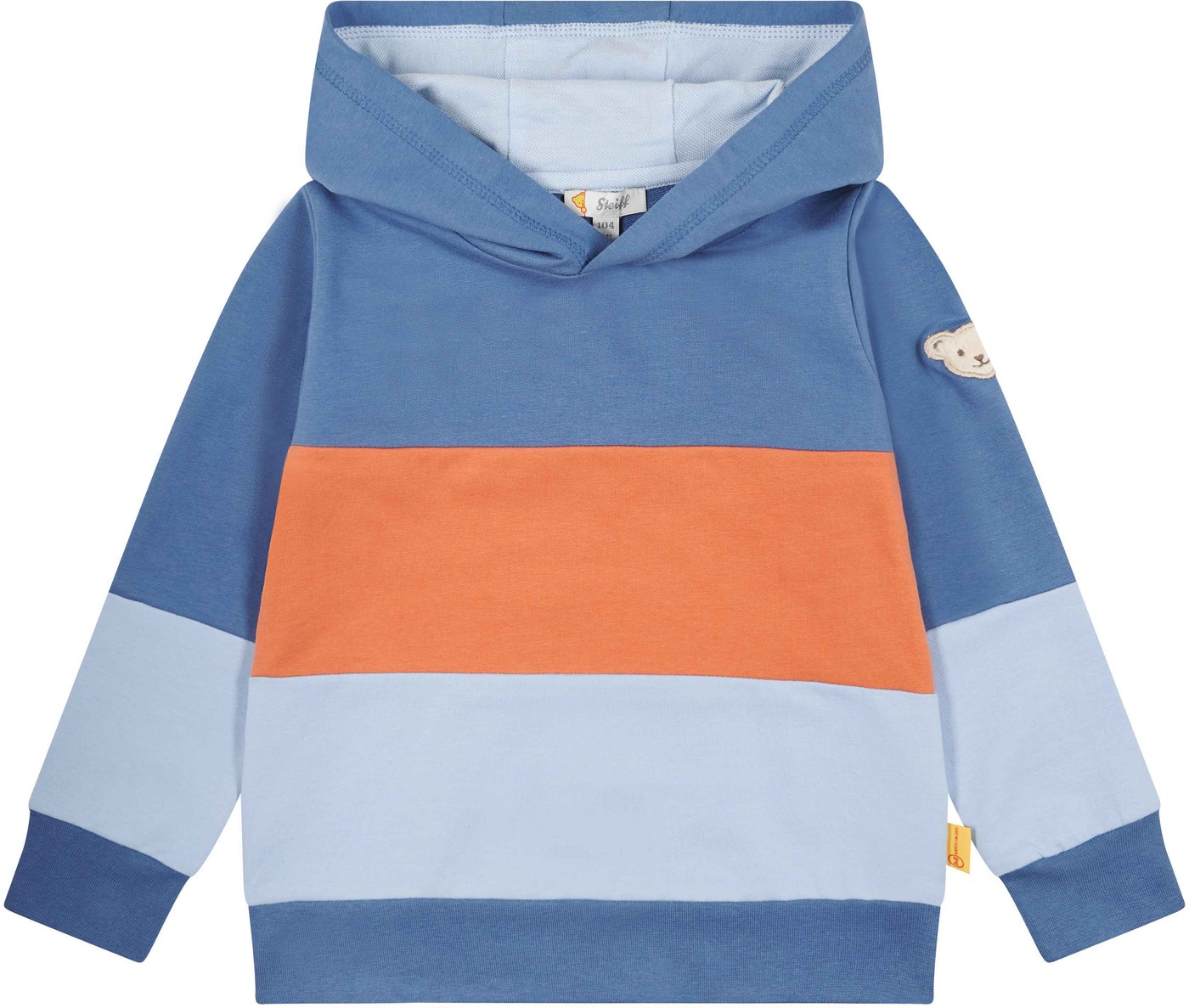 Hübsches Sweatshirt mit Kapuze aus der Catcher-Kollektion von STEIFF für Jungen. Der weiche Sweat sorgt für ein herrliches Tragegefühl. Die Blockstreifen sorgen für einen coolen Look. Ein flauschiges STEIFF Teddybärmotiv schmückt den Oberarm.