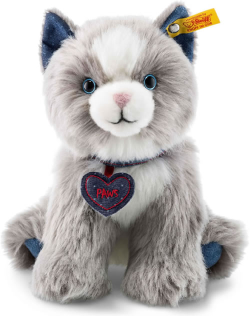 Paws Katze aus der Serie Denim Darlings ist 21 cm groß und mit ihrem grau-weißen Fell eine wahre Schmusekatze, mit dem man nicht nur viele Abenteuer erleben sondern auch herrlich kuscheln kann. Die Katzenöhrchen, Pfoten und das Halsband mit Herzanhänger sind aus Jeansstoff. Ein drolliger Stubentiger zum Verschenken.