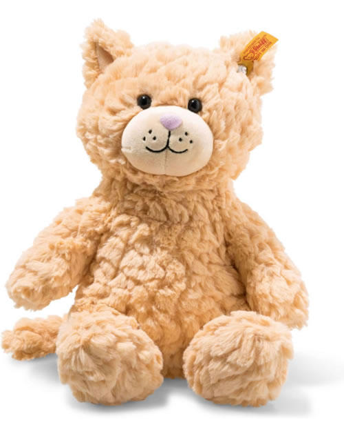 Zuckersüß kommt Whiskers Katze um die Ecke. Ihr apricotfarbener, kuschelweicher Plüsch glänzt in der Sonne. Der lächelnde Mund und die Bartstoppeln sind in Schwarz gestickt. Dazu passt die niedliche rosa Nase. Farblich in hellerem Orange abgesetzt sind die Innenohren und die Mundpartie. Die eingearbeiteten Granulatsäckchen im Gesäß, den Pfoten und Sohlen sorgen für einen guten Halt. Mit ihren 38 cm kann man Whiskers Katze ganz prima in die Arme schließen.