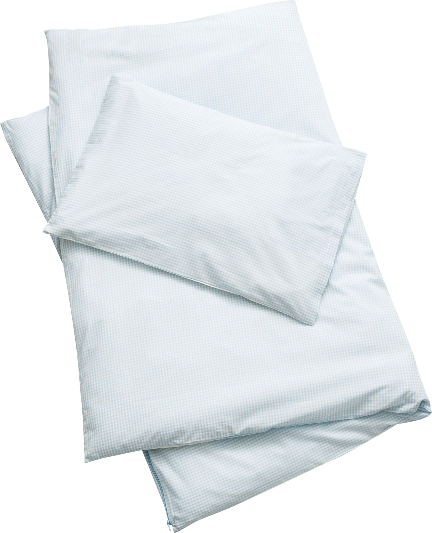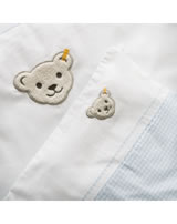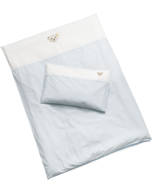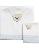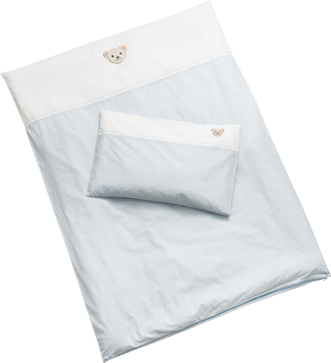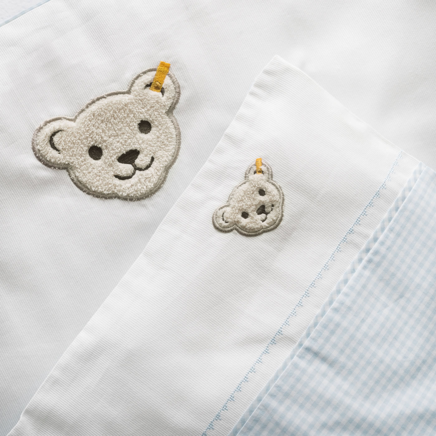 Hübsche Bettwäsche-Garnitur in weiß und blau mit Karo-Optik und kuschelweicher Steiff Teddybären-Applikation. Die Bettwäsche wird in einer eleganten Geschenkbox geliefert.