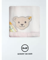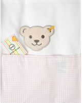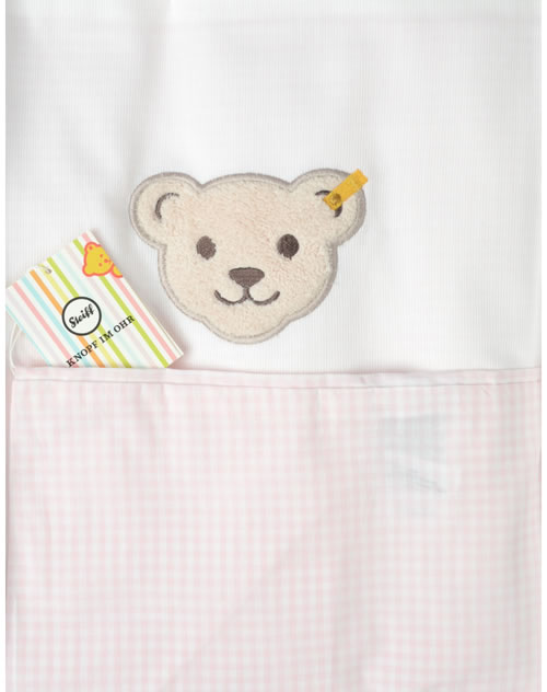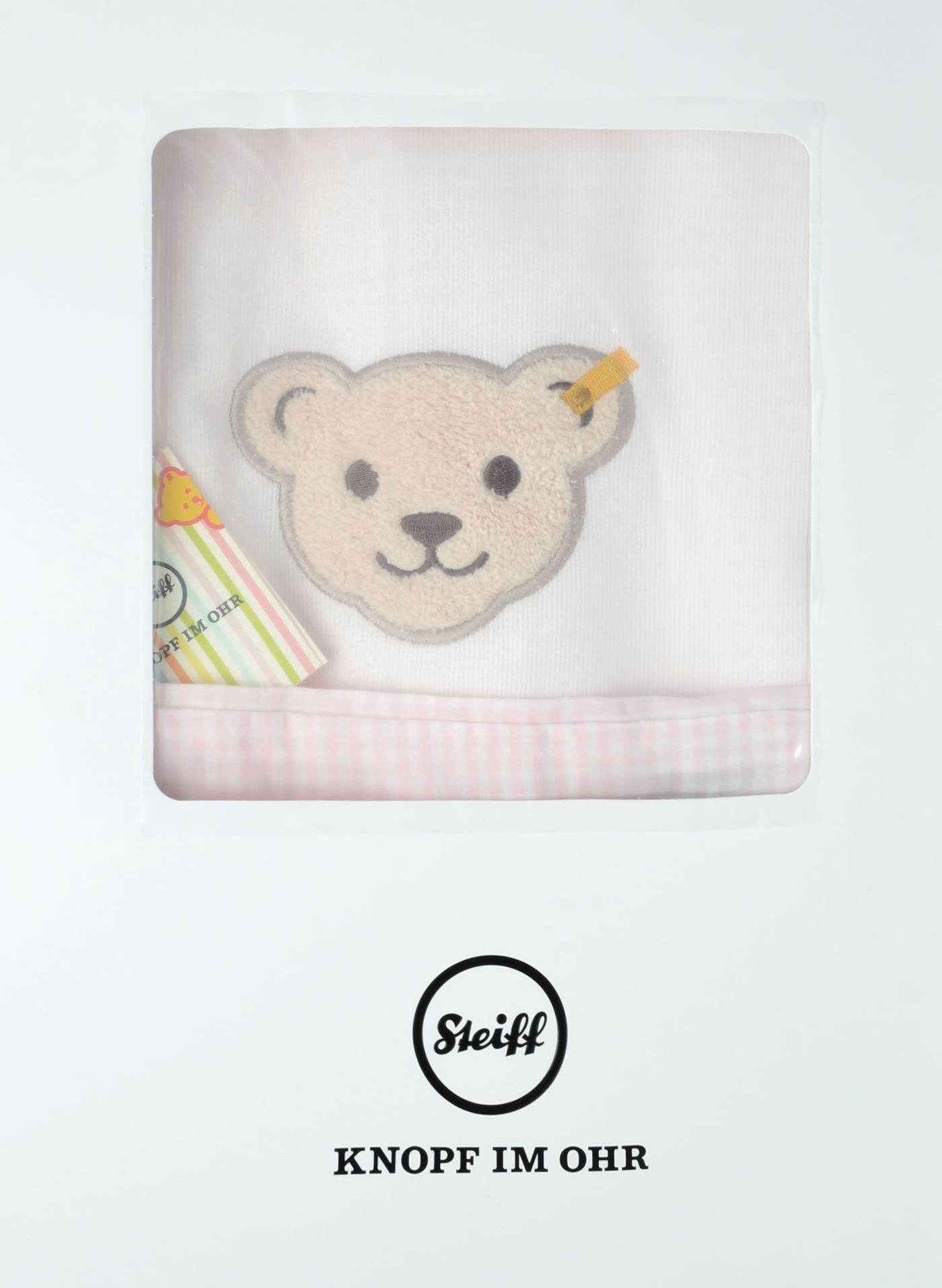 Hübsche Bettwäsche-Garnitur in weiß und rosa mit Karo-Optik und kuschelweicher Steiff Teddybären-Applikation. Die Bettwäsche wird in einer eleganten Geschenkbox geliefert.