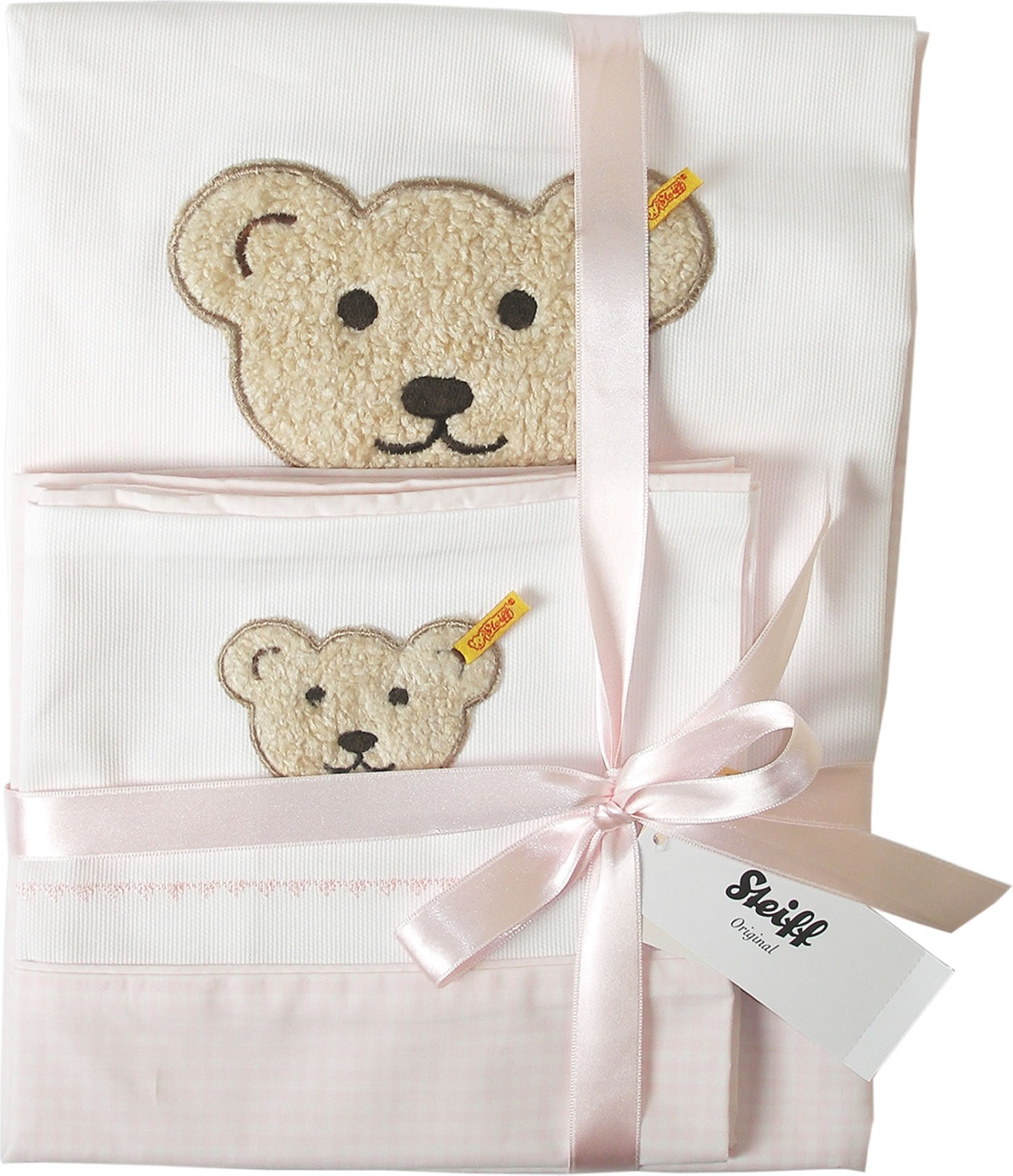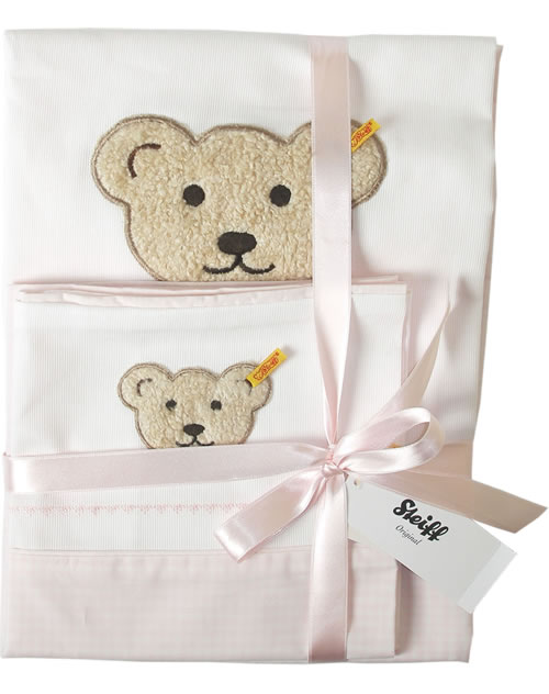 Rosefarbene und weiße Bettwäsche-Garnitur mit kuschelweicher Steiff Teddybären-Applikation und schönen Bordüren. Die Bettwäsche wird in einer eleganten Geschenkbox geliefert.