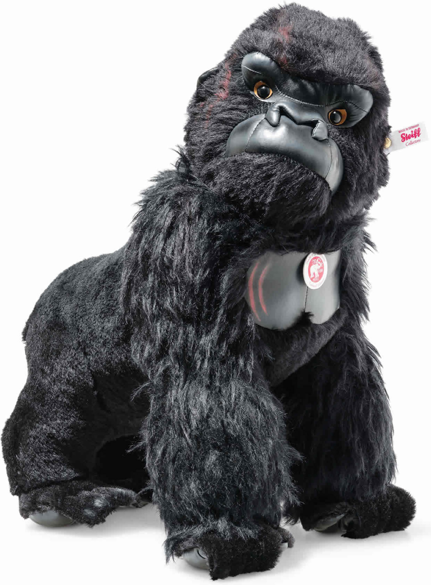 Eine weltberühmte Legende ist der mächtige King Kong. Ein Sammlerobjekt aus schwarzem Mohair und Kunstlederapplikationen. King Kong ist 42 cm groß und 1-fach gegliedert. Ein Gliederdraht unterstützt die machtvolle Haltung. In Grau und Rot sind Akzente mit Airbrushtechnik gesetzt. Mit vergoldetem "Knopf im Ohr". Ihm gebührt ein Ehrenplatz in jeder Sammlerkollektion. Produziert in limitierter Auflage von 750 Stück.