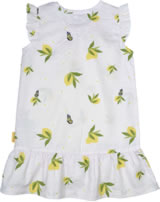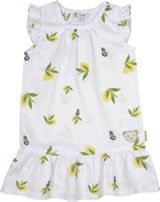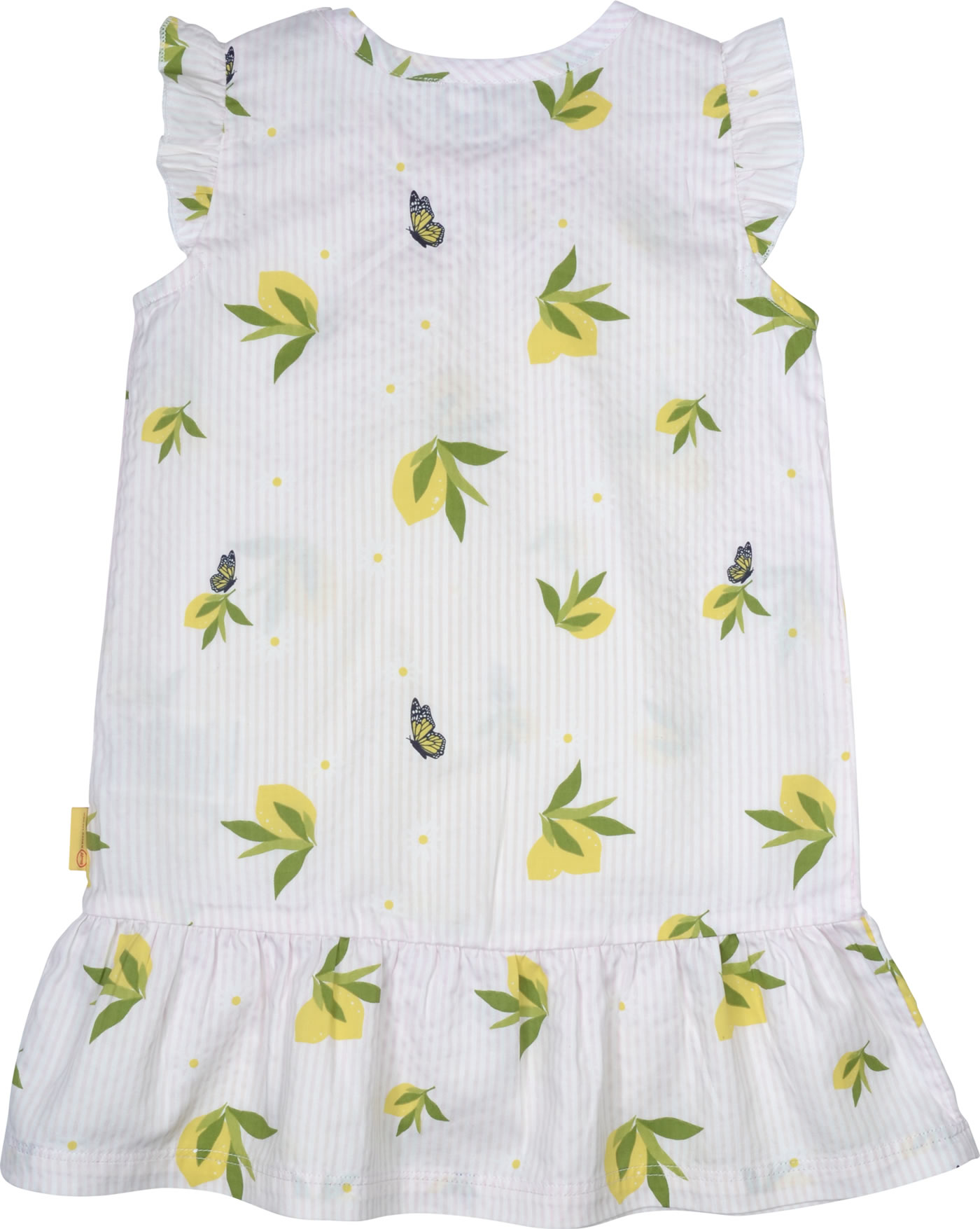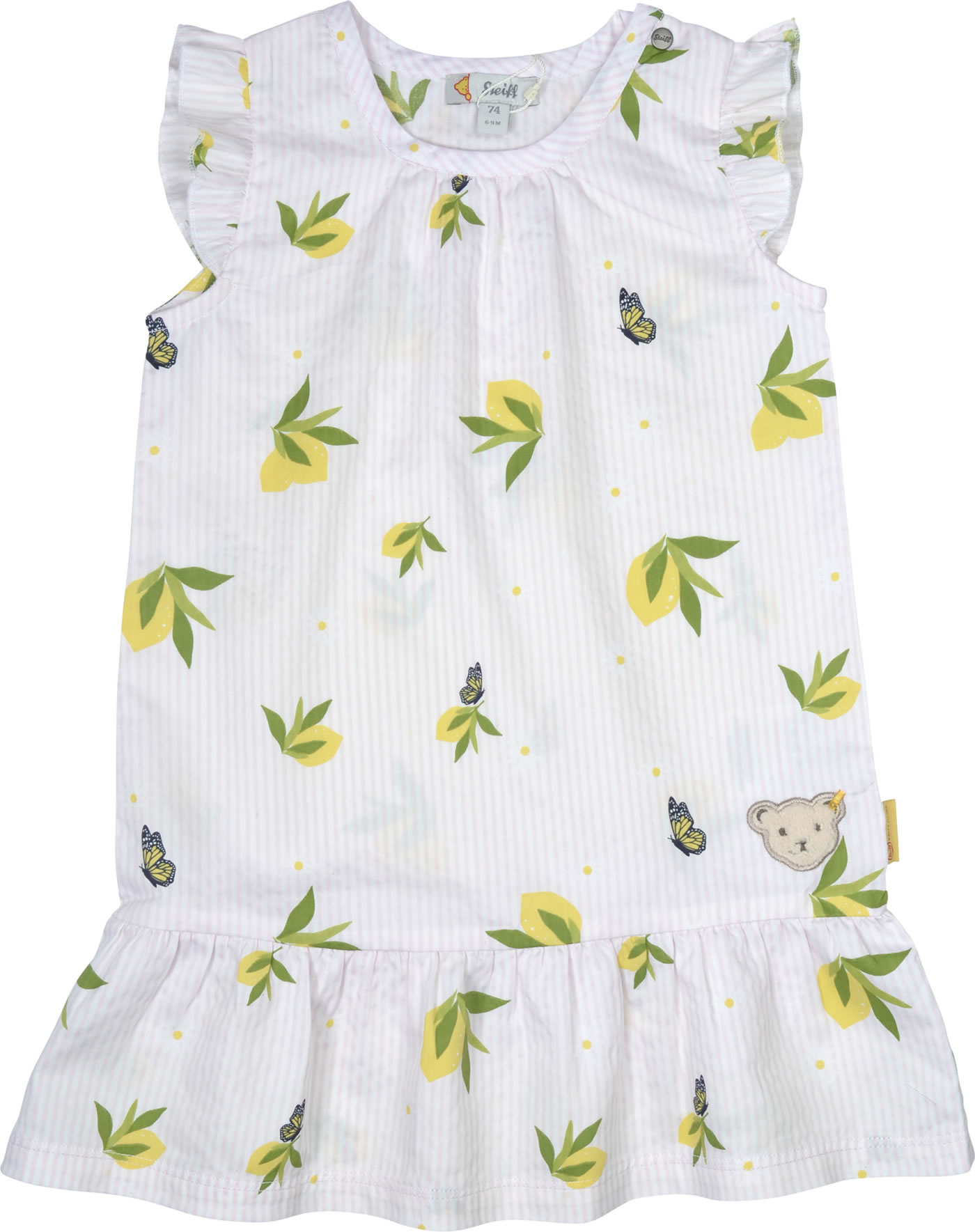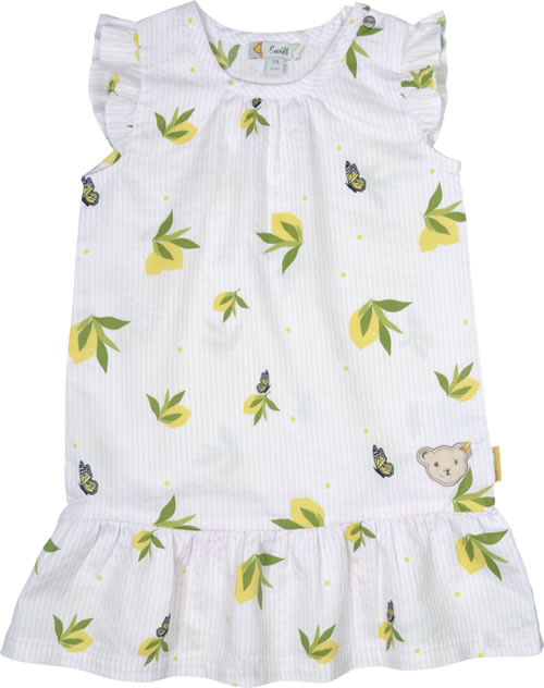 Ärmelloses Kleid von STEIFF aus der Hello Summer Kollektion. Der leichte Stofft macht das Kleid ideal für die heißen Tage. Verschlossen wird es mit Knöpfen auf der Schulter. Besonders schön ist das zarte Streifenmuster mit Zitronen und Schmetterlingen mit dem kleinen STEIFF Bären auf der Vorderseite.
