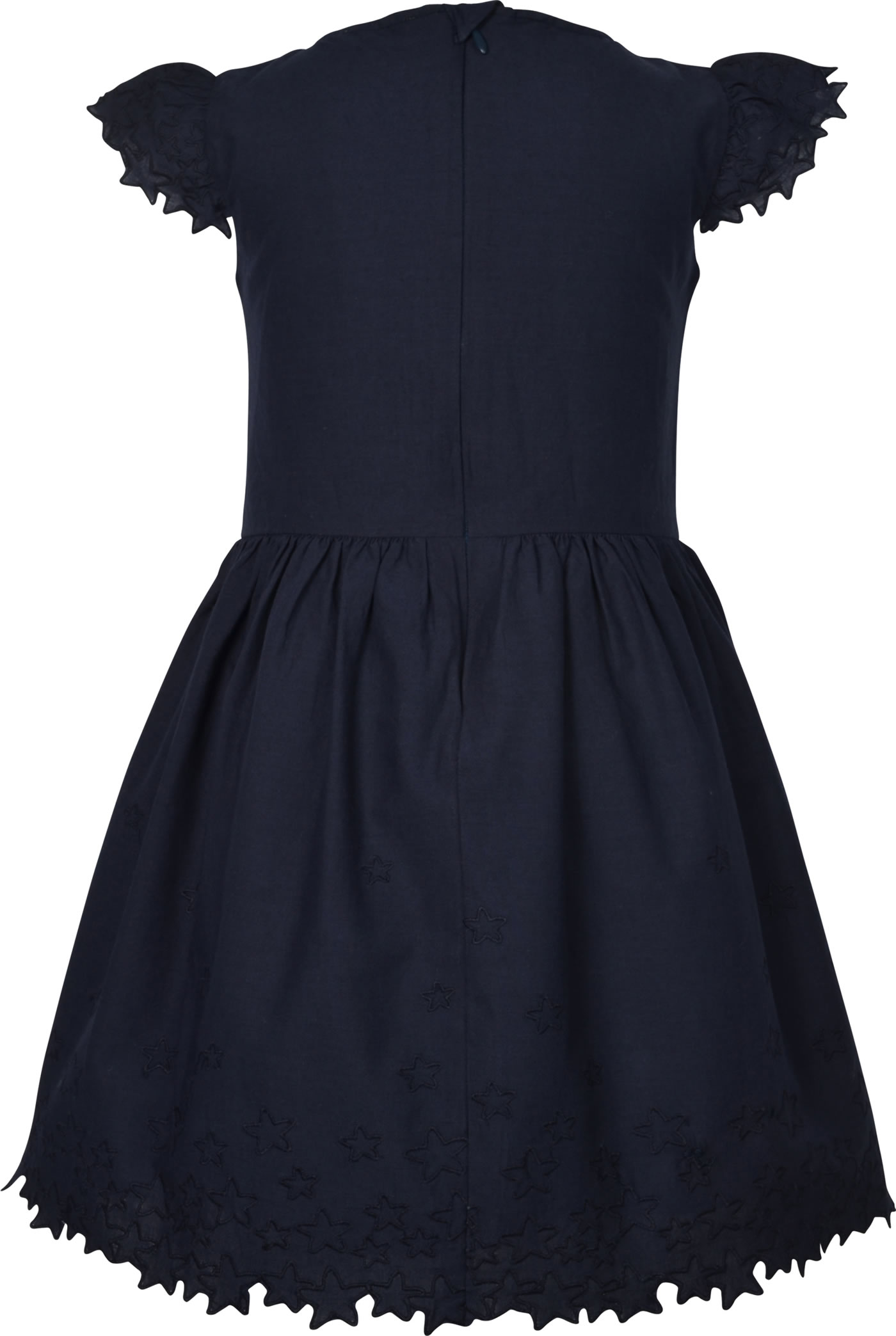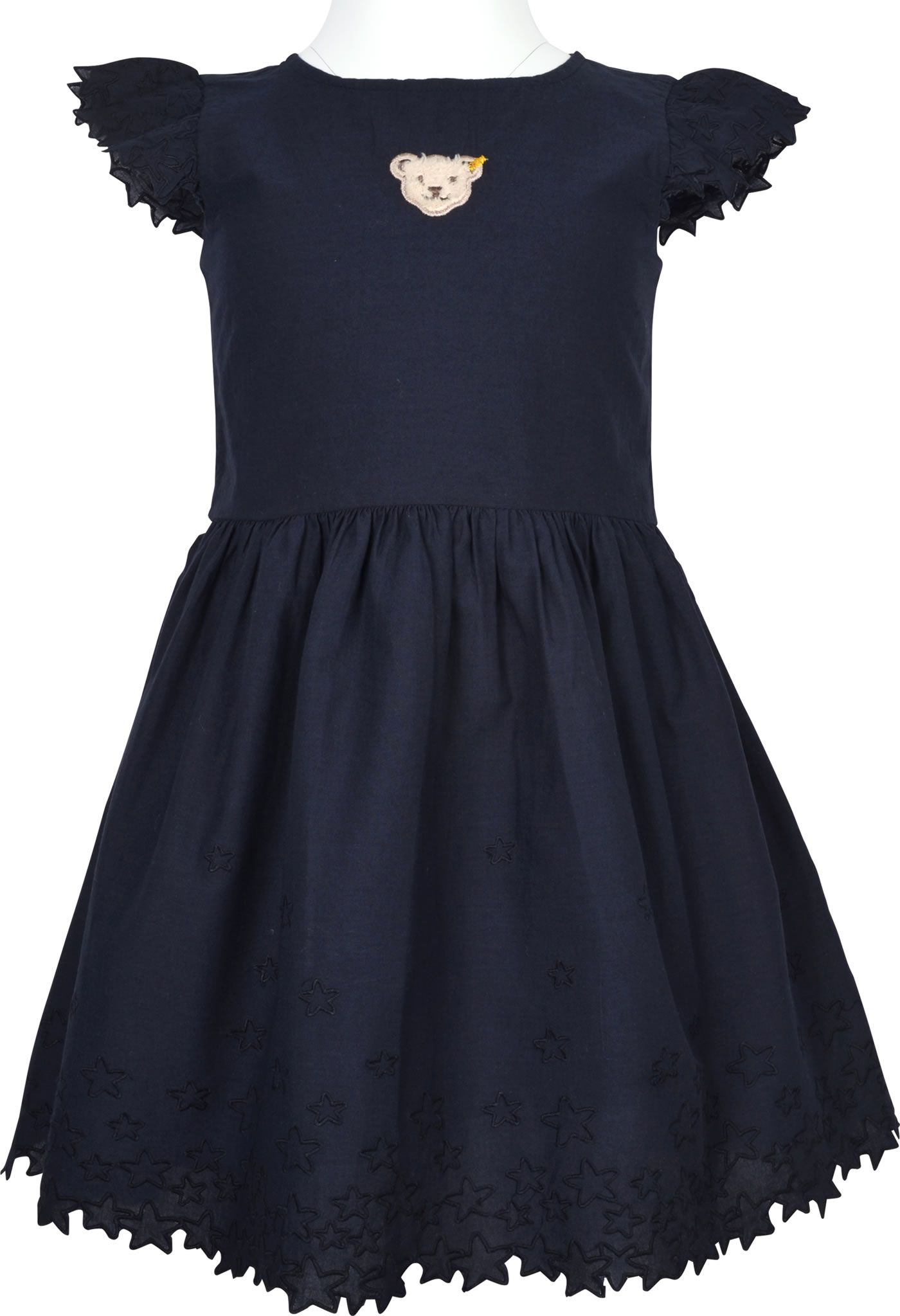 Hübsches Sommer-Kleid von STEIFF aus der Beach Please Kollektion. Das Kleid mit Reißverschluss auf der Rückseite ist aus weichem Baumwollstoff und hat einen lockeren Schnitt. Es ist doppellagig gearbeitet und dadurch blickdicht. Besonders schön sind die gestickten Sterne am Rock und den Ärmeln und der STEIFF Bär auf der Brust.