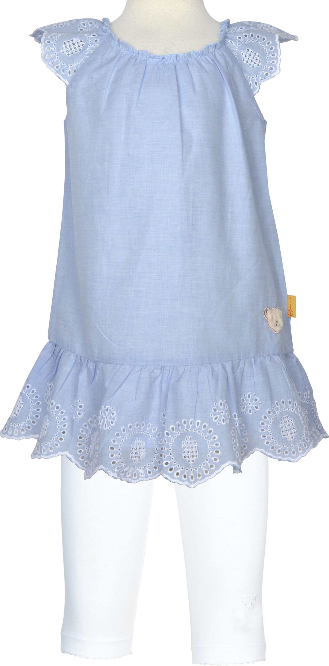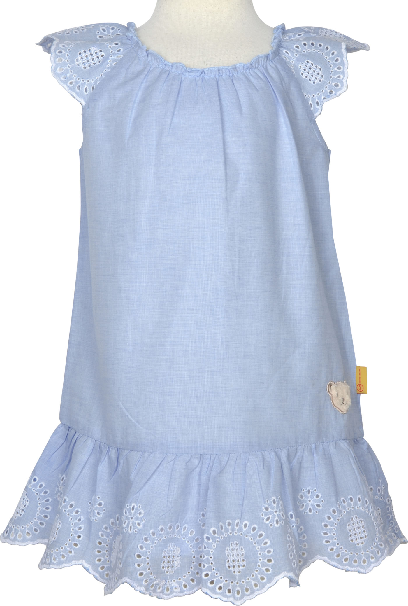 Hübsches Kleid von STEIFF aus der Hello Summer Kollektion. Das leichte Sommerkleid aus Baumwollstoff hat durch die Raffung am Hals einen guten Sitz. Besonders schön ist die durchbrochene Spitze an den Ärmeln und am Saum. Der STEIFF Bär ziert den unteren Rand. Weißer Futterstoff macht das Kleid blickdicht.