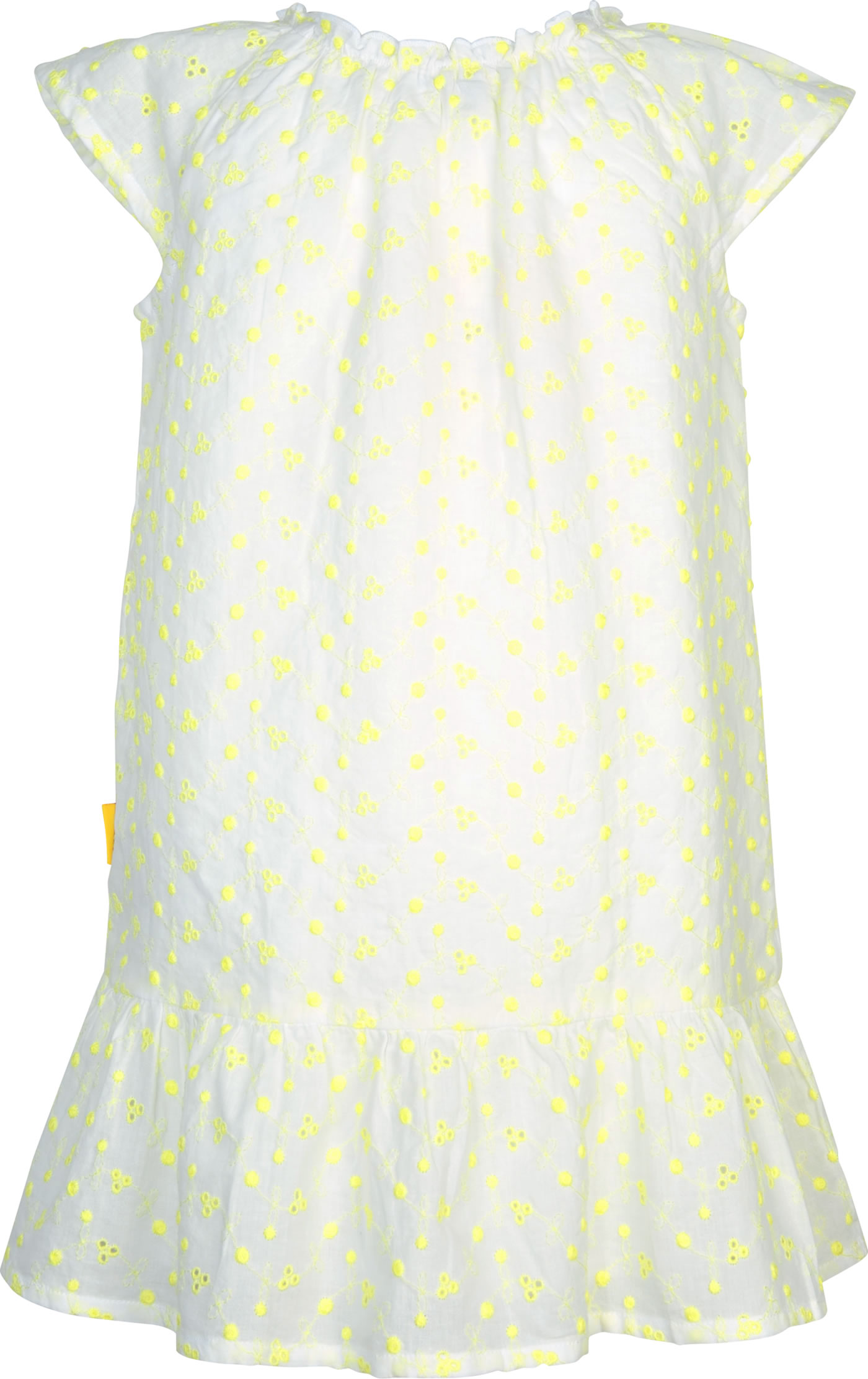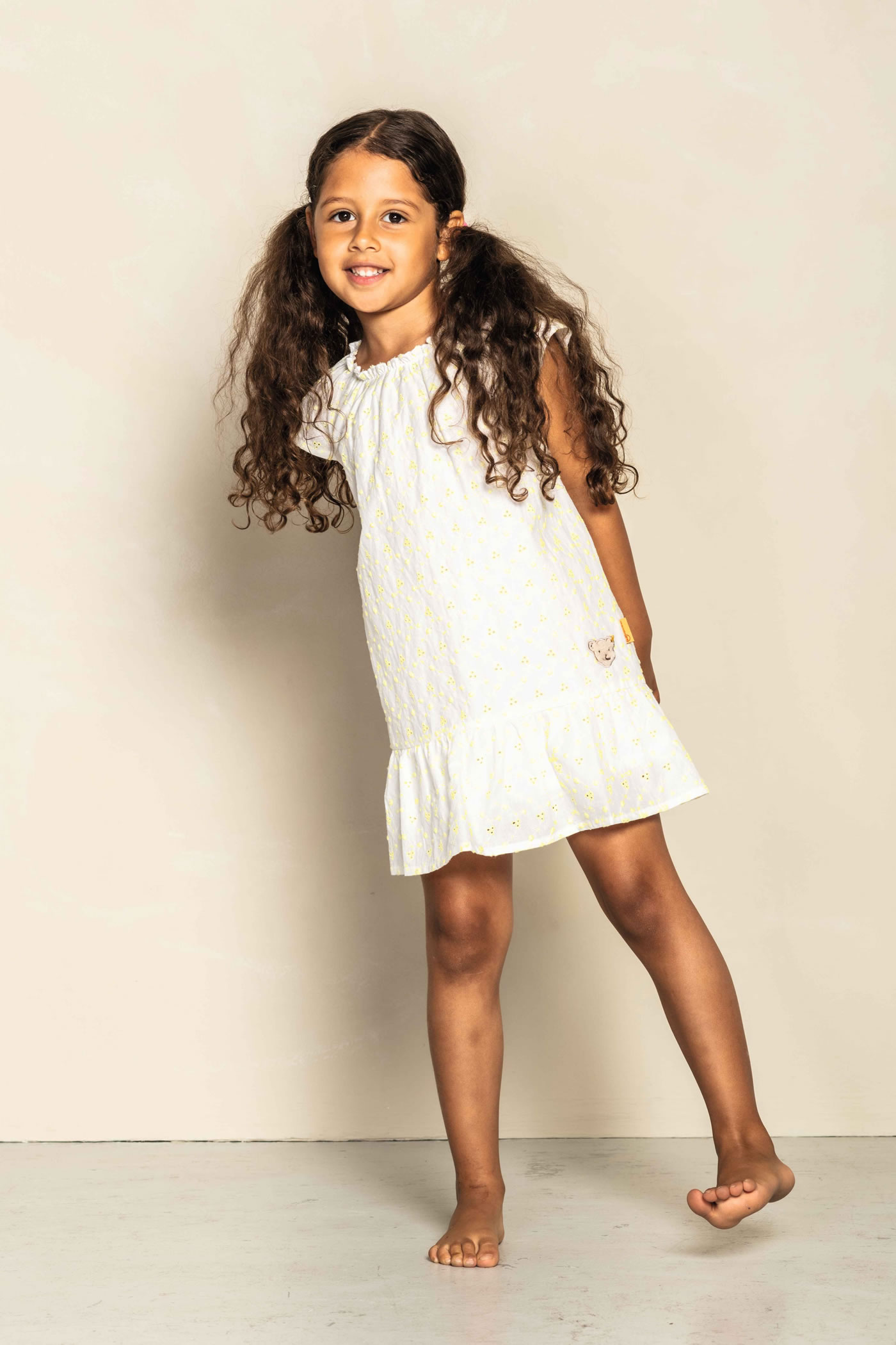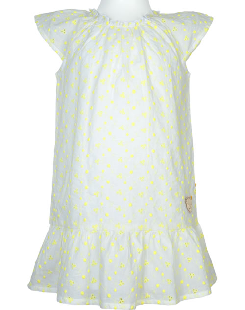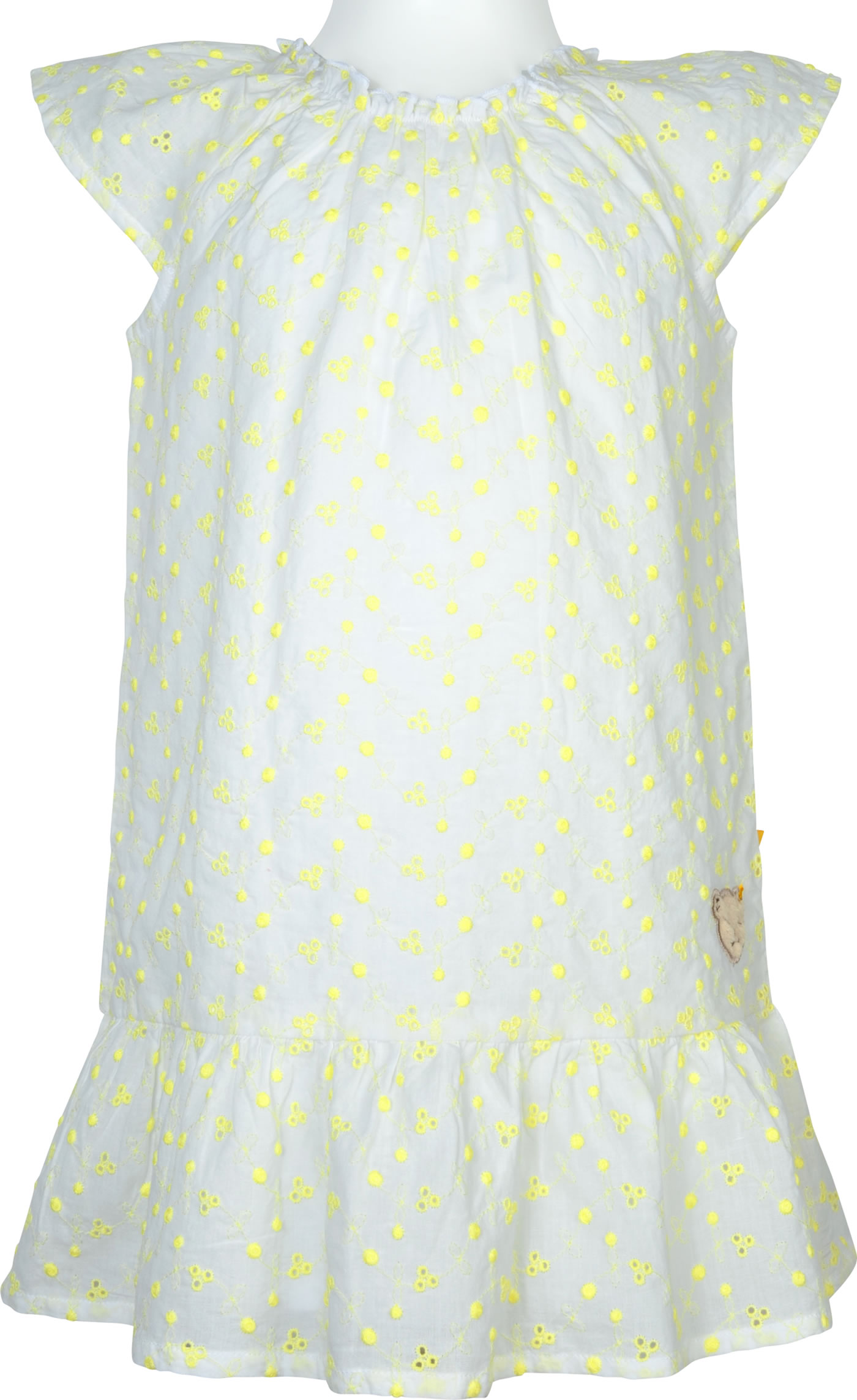 Hübsches Sommer-Kleid mit Flügelärmeln von STEIFF aus der Garden Party Kollektion. Das Kleid mit elastischem Halsausschnitt ist aus leichtem Baumwollstoff und hat einen lockeren Schnitt. Der weiße Futterstoff sorgt für Blickdichte. Besonders schön sind die Lochstickerei mit gelben Blüten und der STEIFF Bär auf der Vorderseite.