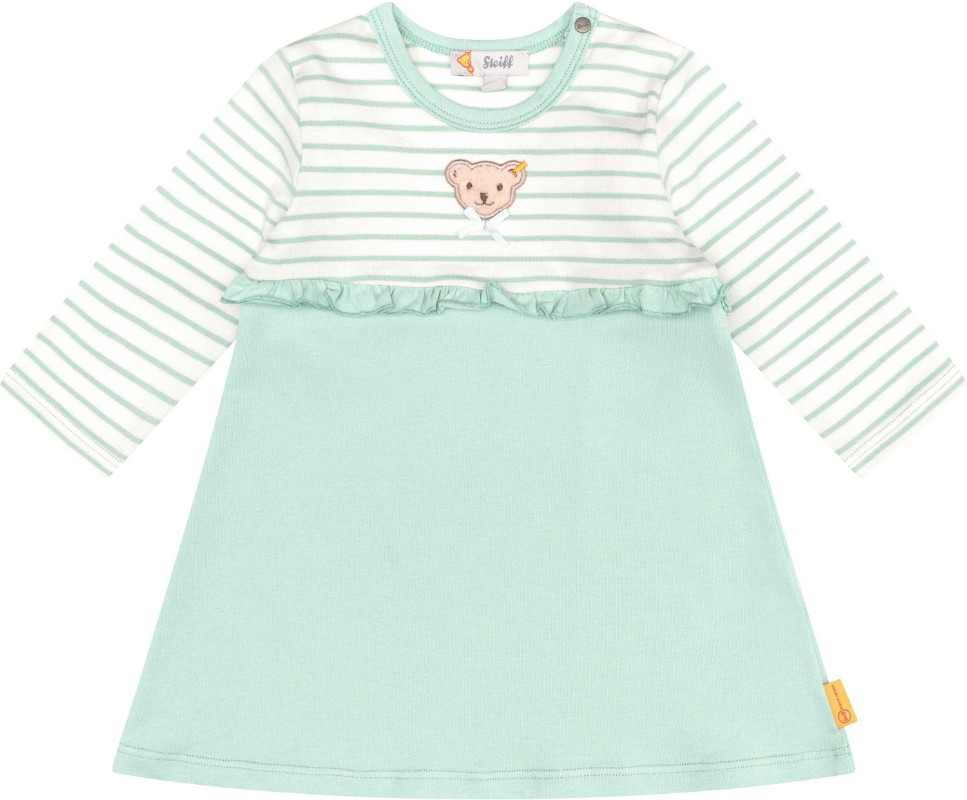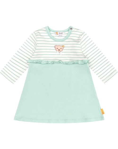 Schönes und bequemes Jersey-Kleid für Mädchen aus der Jungle Feeling-Kollektion von STEIFF. Das Kleid ist in A-Linie geschnitten und bietet viel Bewegungsfreiheit. Schöne Details sind der mit Rüschen abgesetzte Rock und der kleine STEIFF Bär mit Schleife, der die Vorderseite ziert.