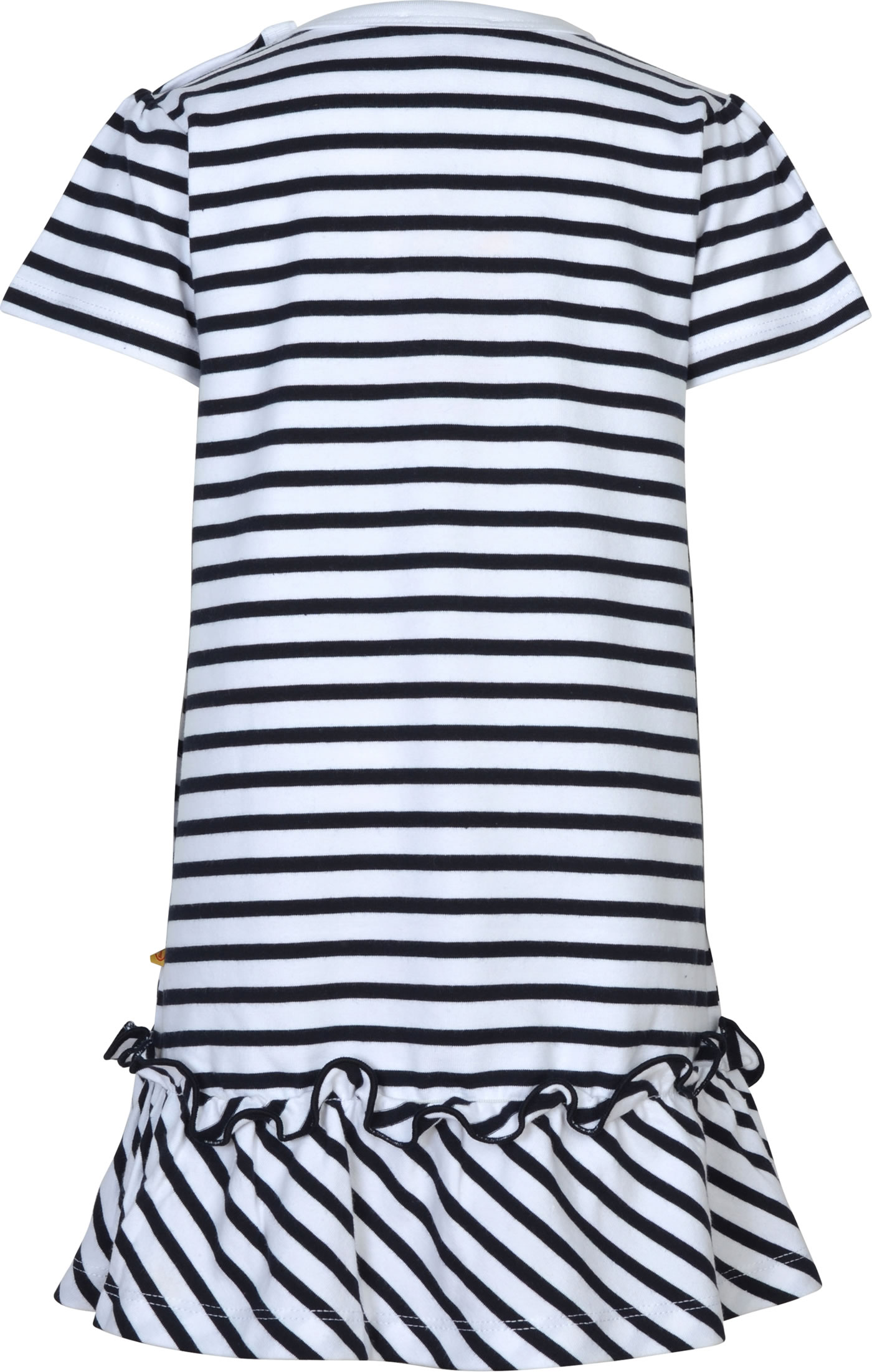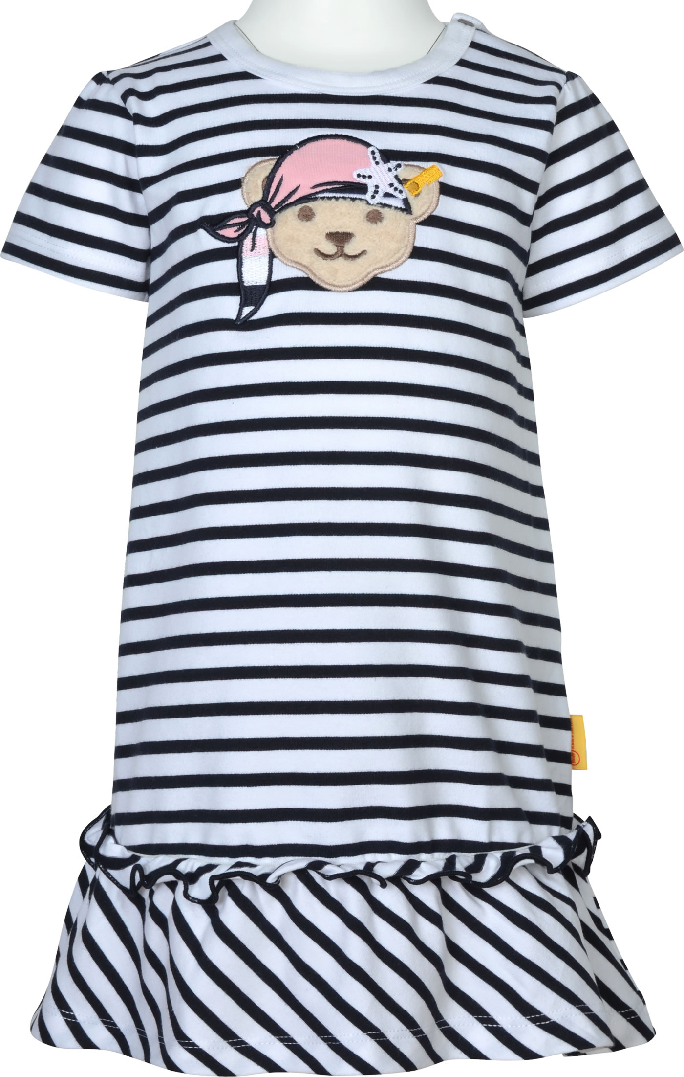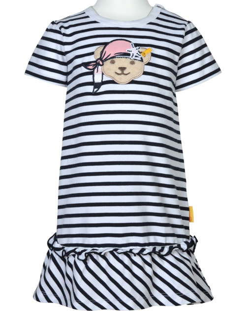 Hübsch geringeltes Kleid von STEIFF aus der Beach Please Kollektion. Das Sommerkleid aus Jersey hat einen weiten Schnitt und bietet dadurch viel Bewegungsfreiheit. Ein besonderer Hingucker ist der STEIFF Bär mit Piratenkopftuch auf der Vorderseite.