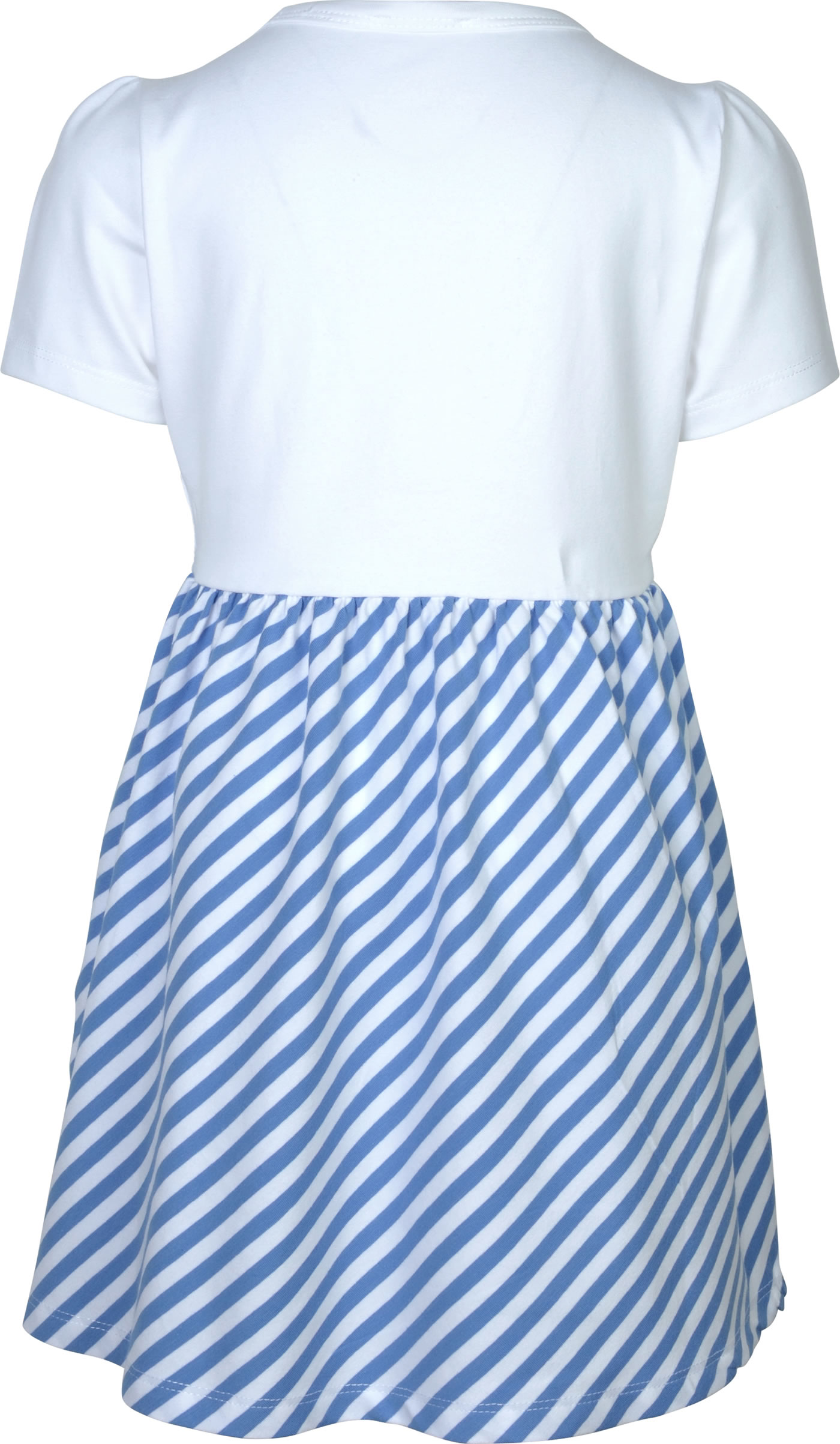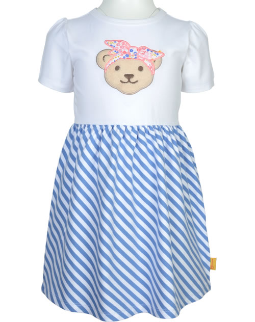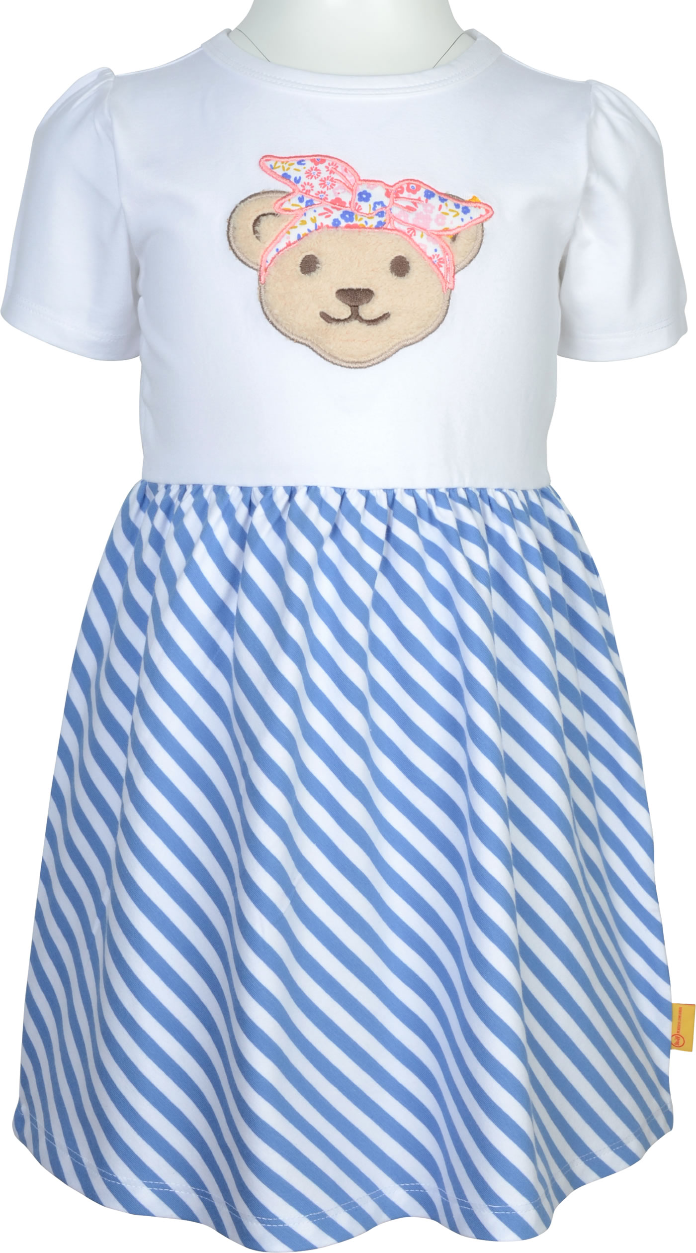 Zauberhaftes Kleid von STEIFF aus der Serendipity-Kollektion. Das Kleid hat ein einfarbiges Oberteil und einen gestreiften Rock. Der Halsausschnitt ist elastisch. Der Rockteil ist leicht ausgestellt und sorgt so für einen angenehmen Sitz. Der STEIFF Bär ziert die Vorderseite.