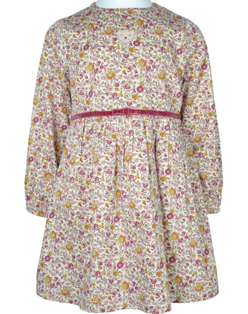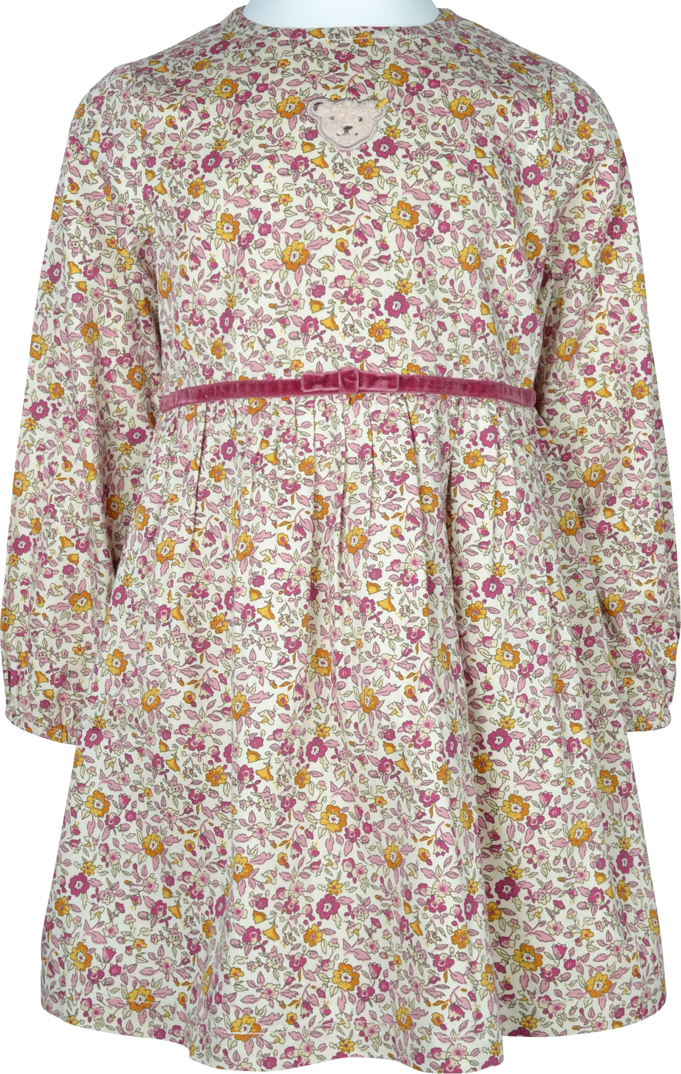 Geblümtes Kleid mit langen Ärmeln aus der Best Friends-Kollektion von STEIFF. Das Kleid aus festem Baumwoll-Gewebe wird mit einem Reißverschluss auf der Rückseite verschlossen. Gefüttert ist es mit cremefarbenem Baumwoll-Stoff. Besonders schöne Details sind der STEIFF Bär auf der Brust und das Taillenband aus Samt. Der Rock ist weit ausgestellt und bietet dadurch viel Bewegungsfreiheit.