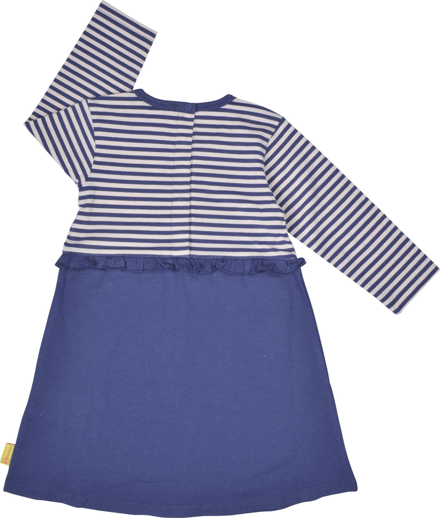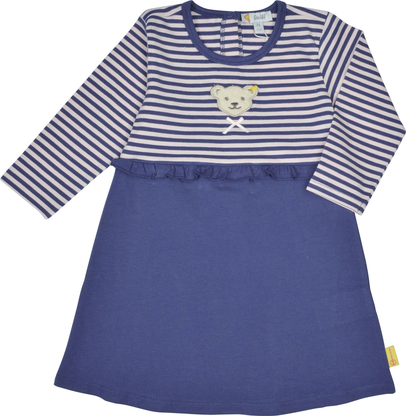 Wunderschönes Langarm-Kleid von STEIFF aus der Bugs Life-Kollektion. Das Kleid ist in A-Linie geschnitten. Das weiche Jersey-Material sorgt für einen hohen Tragekomfort. Schöne Details sind der STEIFF Bär mit Schleife auf der Brust und die Rüschenkante in der Taille. Verschlossen wird das Kleid mit Druckknöpfen auf der Rückseite.