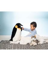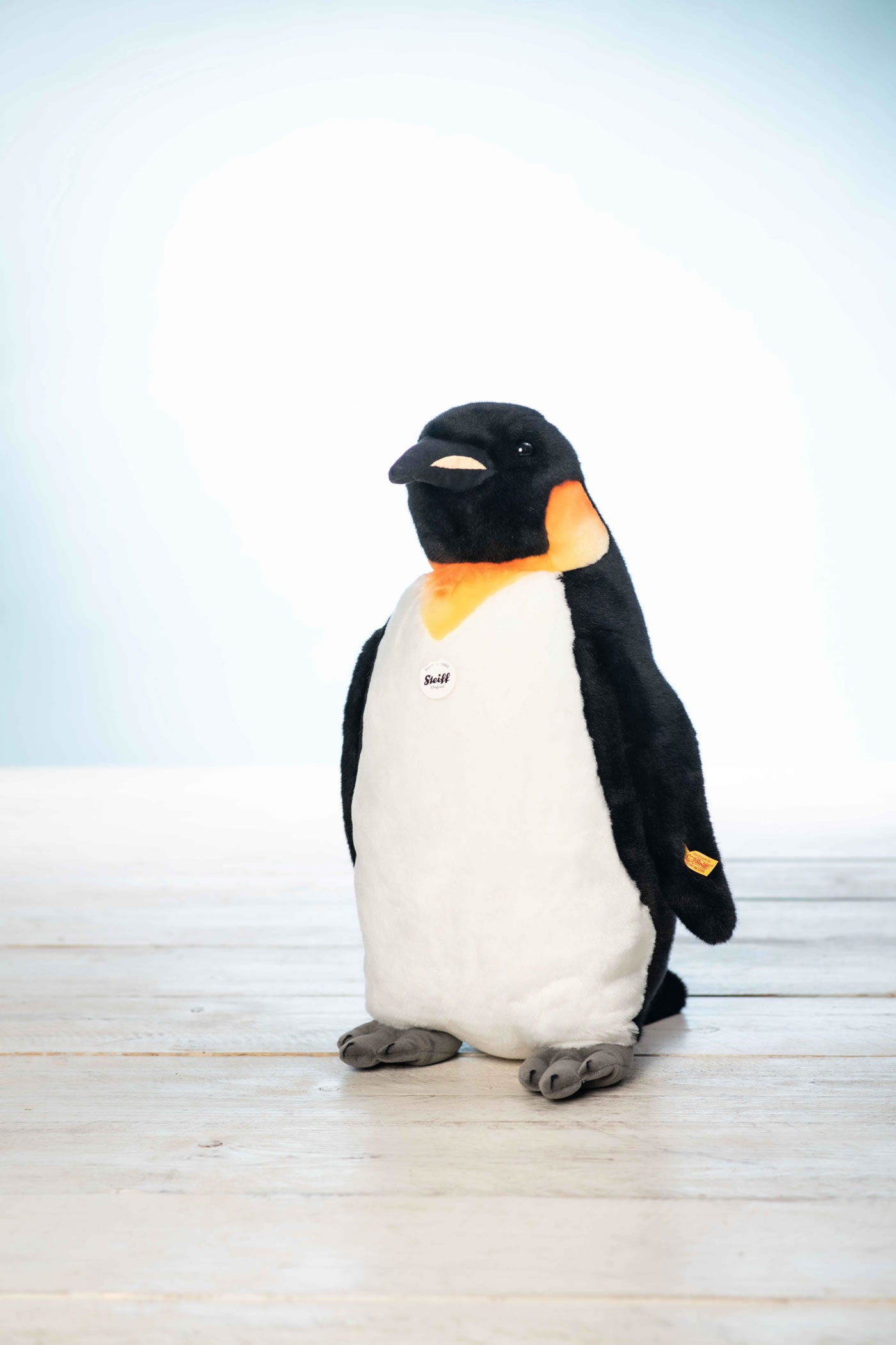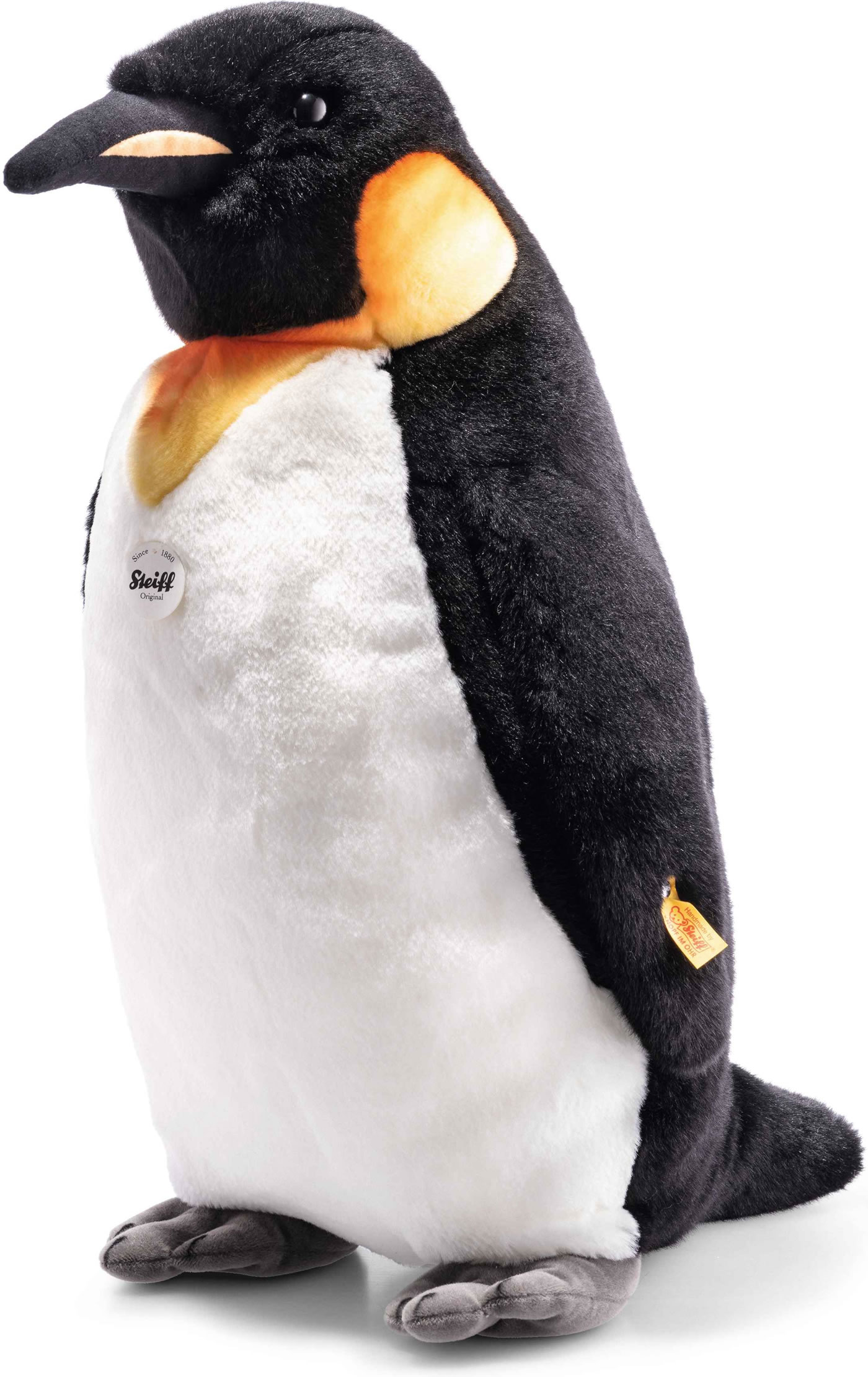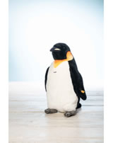 Palle Königspinguin sieht seinen lebenden Vorbildern zum Verwechseln ähnlich. Die Färbung am Hals ist ein sehr schönes Detail. Er ist aus kuschelweichem Plüsch mit synthetischem Füllmaterial gestopft und hat einen vermessingten Knopf im Ohr. Der Pinguin steht aufrecht und hat eine Größe von 52 cm.
