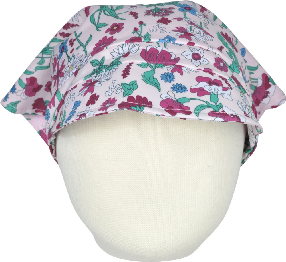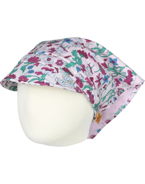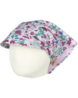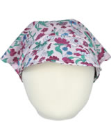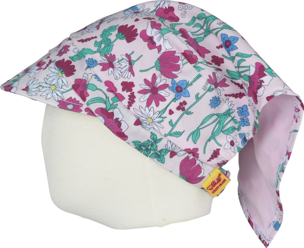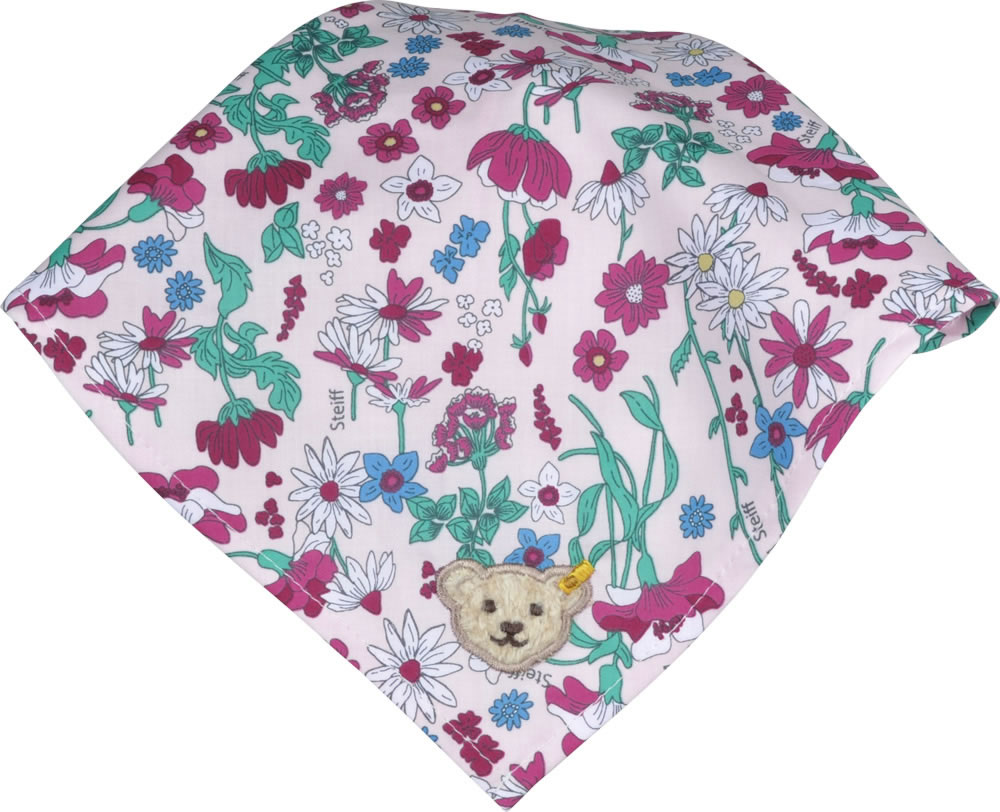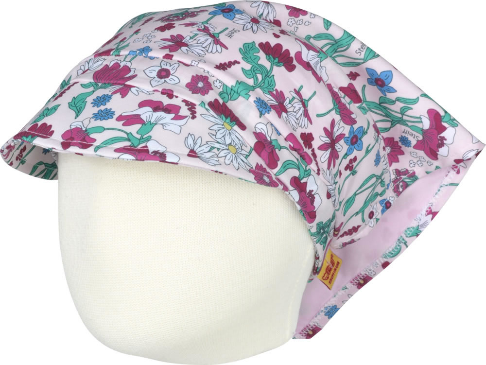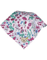 Floral gemustertes Kopftuch mit kleinem Schirm von STEIFF aus der Wildflowers-Kollektion für Mädchen. Der kleine STEIFF Bär ziert die Spitze im Nacken. Ein mit Stoff umnähtes Gummiband im Nacken sorgt für den richtigen Sitz des Kopftuchs.