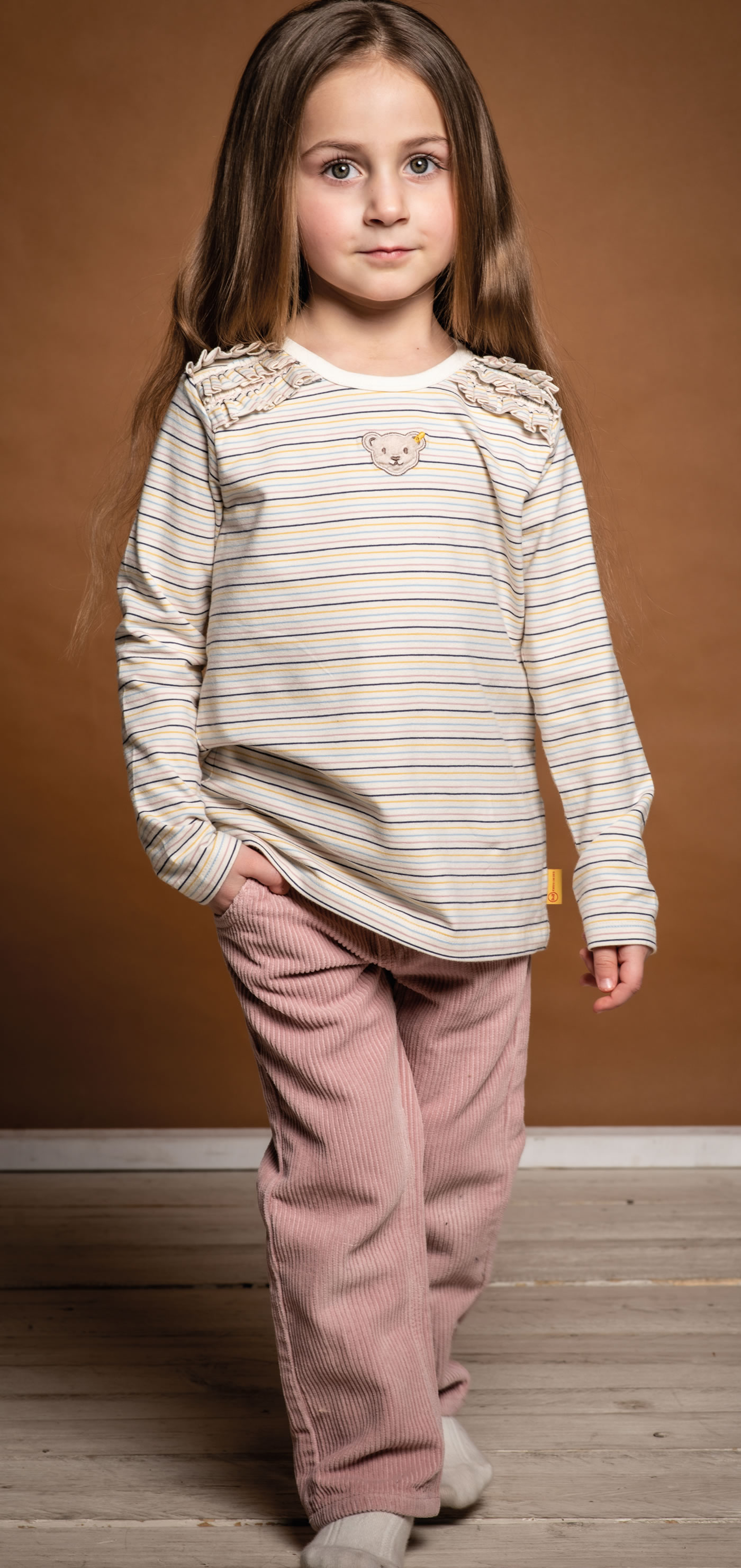 Hose aus Breitkord für Mädchen von STEIFF aus der Nut Cracker-Kollektion. Klassisch gerade geschnitten im Four-Pocket -Stil und mit verstellbarem Bund ist die Hose in zartem rosa ein herbstliches Kombi-Talent. Bequem, chic und alltagstauglich - da bleiben keine Wünsche offen. Natürlich ist der kleine Teddy auf der Gesäßtasche mit unterwegs.