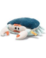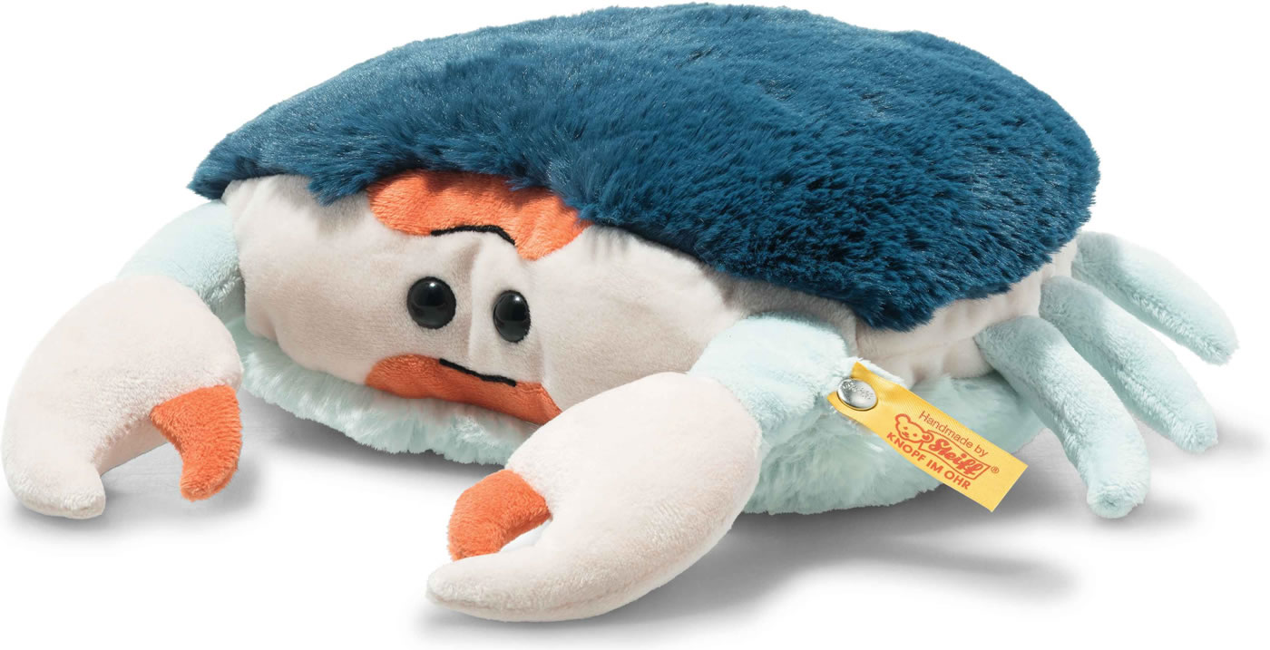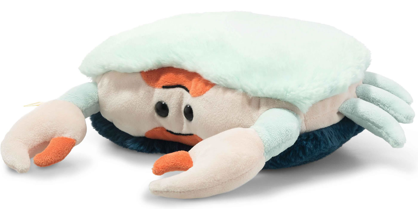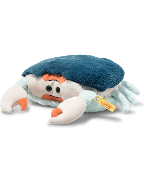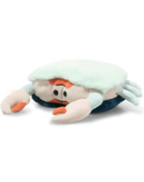 Die 22 cm große, bunte Soft Cuddly Friends Curby Krabbe ist eine pfiffig gestaltete, flinke Bewohnerin der Steiff Unterwasserwelt. Kuschelweiche Plüschschilde in Dunkelblau und Mint – mit angedeuteten stumpfen Krabbenzähnen – schützen den Panzer aus hell orangenem Plüsch. Ihr scharfer Zahn vorne ist orangefarben in den Panzer eingearbeitet, die Scherenzangen passen farblich perfekt. Granulatsäckchen in Körpermitte und Scheren machen den Spielspaß perfekt.