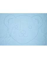 Der ideale Begleiter für das Baby - kuschelig weiche, hellblaue Krabbeldecke mit blauer Paspel von STEIFF aus der Summer Colors-Kollektion. Der STEIFF Bär ziert eine Ecke der Decke und auf der Rückseite befindet sich ein großer gestickter Bär.