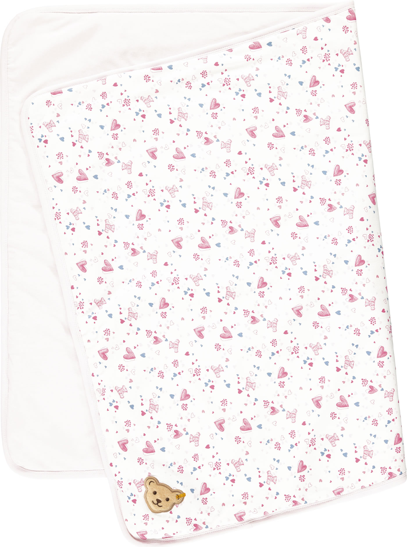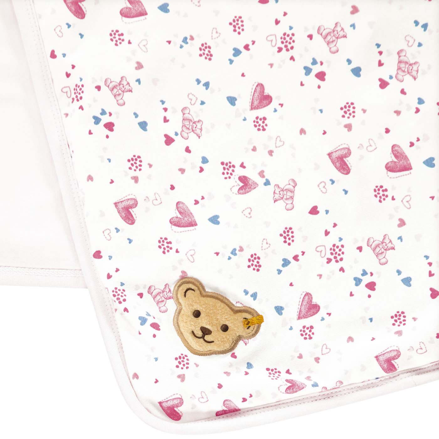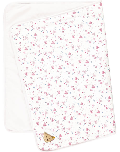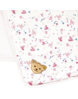 Der ideale Begleiter für das Baby - kuschelig weiche Krabbeldecke mit Steiff Bärenkopf-Applikation auf einer Ecke. Die Unterseite ist rosa und mit dem STEIFF Bärenkopf.