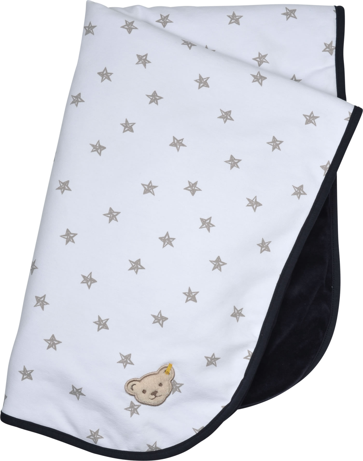 Der ideale Begleiter für das Baby - kuschelig weiche, weiße Krabbeldecke von STEIFF aus der Special Day-Kollektion. Der STEIFF Bär ziert eine Ecke der Decke, die ein Sternen-Muster hat. Die Oberseite ist aus weichem Baumwoll-Stoff und die Unterseite aus Nicki-Material.