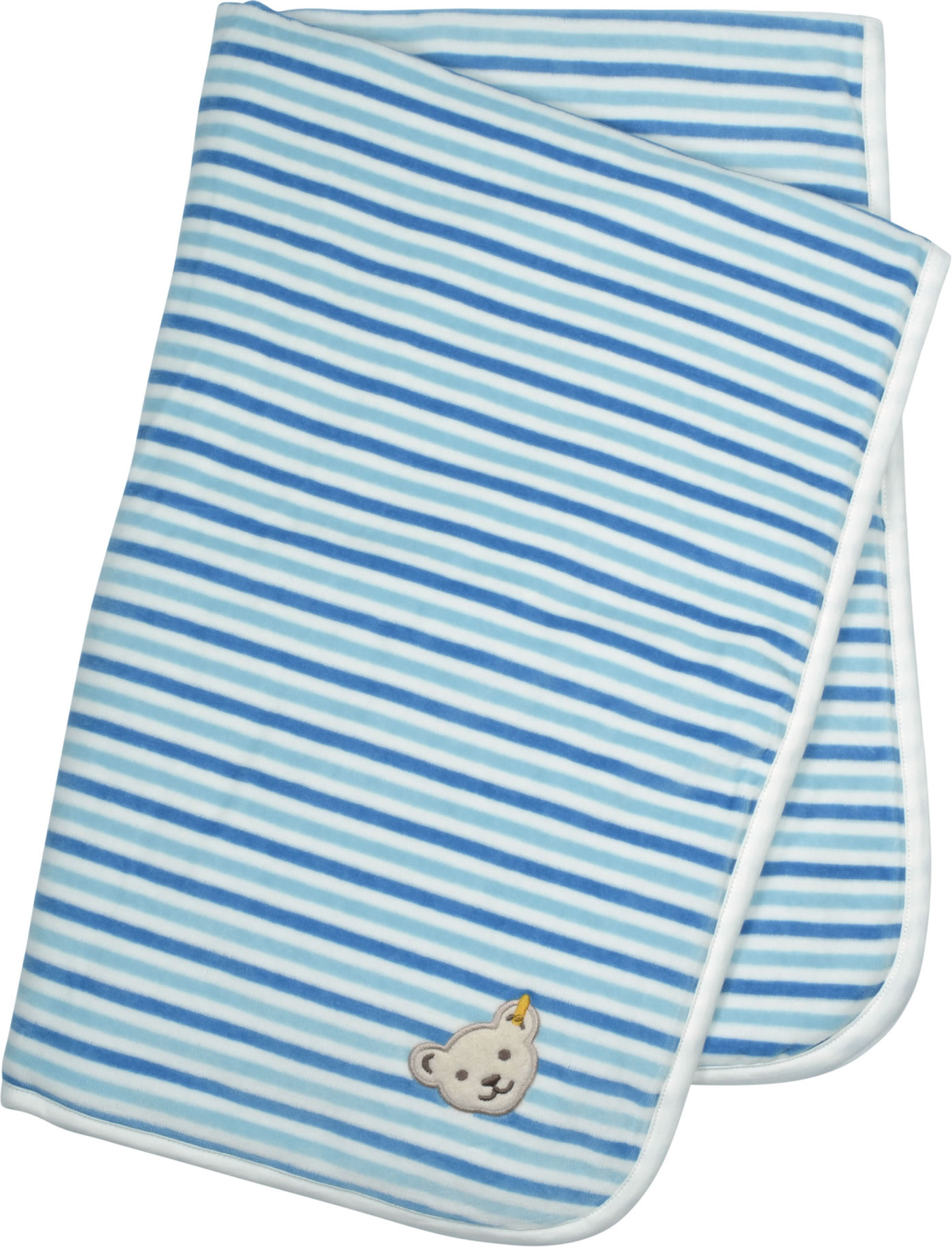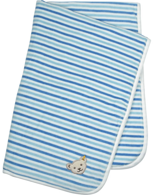 Der ideale Begleiter für das Baby - kuschelig weiche, blau gestreifte Krabbeldecke mit heller Paspel von STEIFF aus der Little Winter Wellness-Kollektion. Der STEIFF Bär ziert eine Ecke der Decke und auf der Rückseite befindet sich ein großer gestickter Bär.