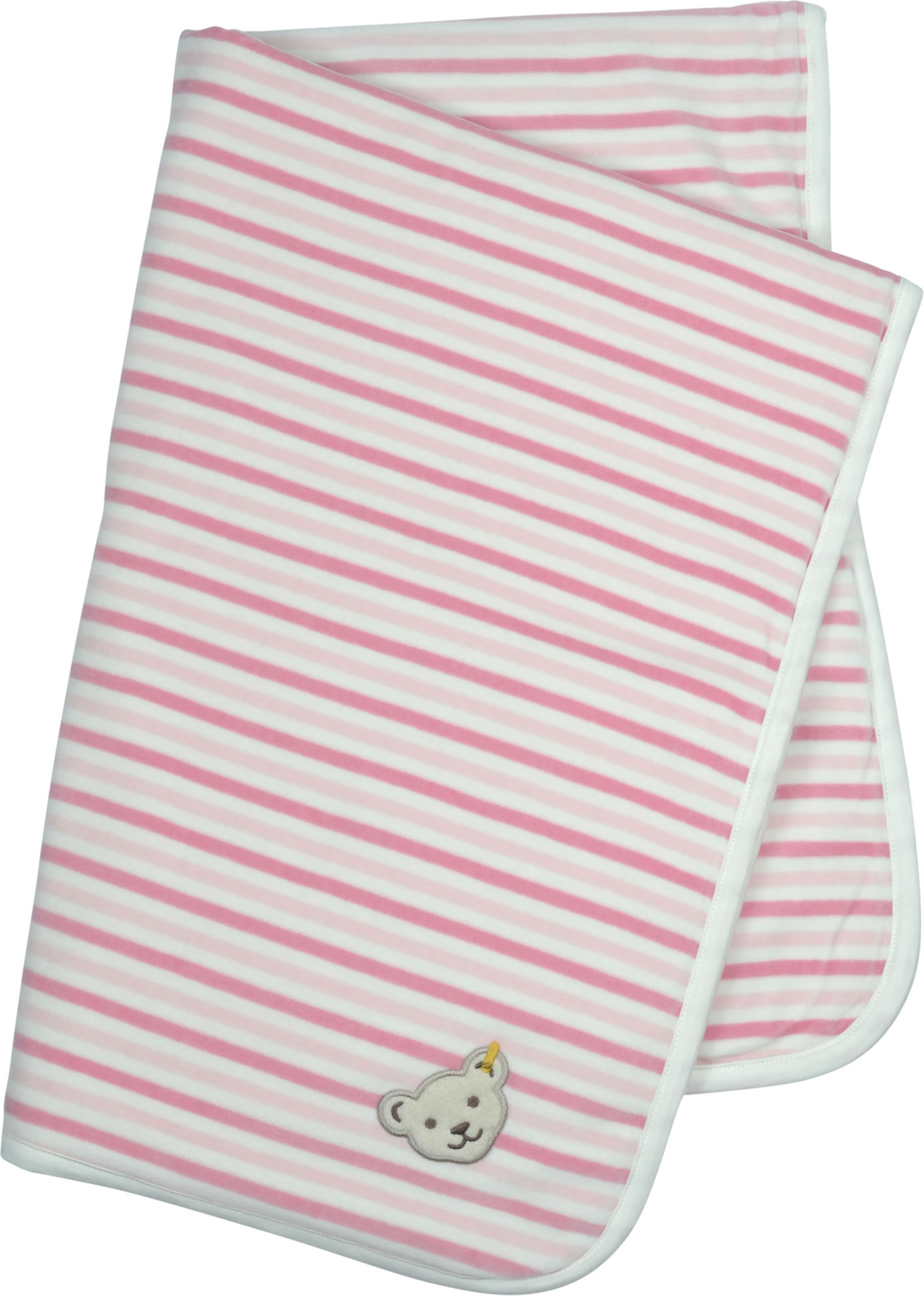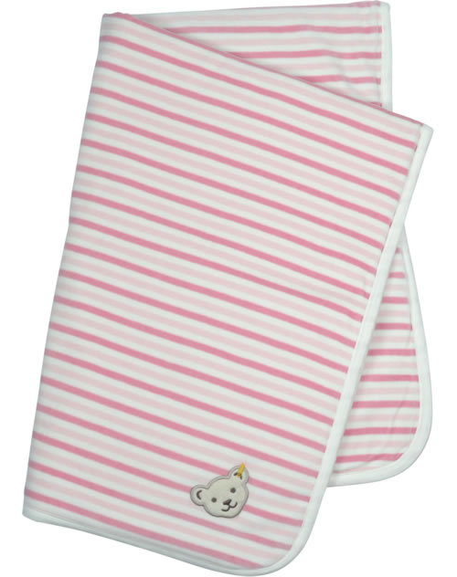 Der ideale Begleiter für das Baby - kuschelig weiche, rosa gestreifte Krabbeldecke mit heller Paspel von STEIFF aus der Little Winter Wellness-Kollektion. Der STEIFF Bär ziert eine Ecke der Decke und auf der Rückseite befindet sich ein großer gestickter Bär.