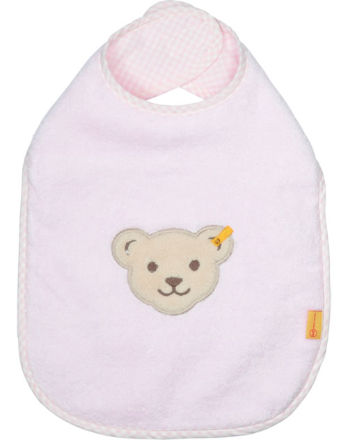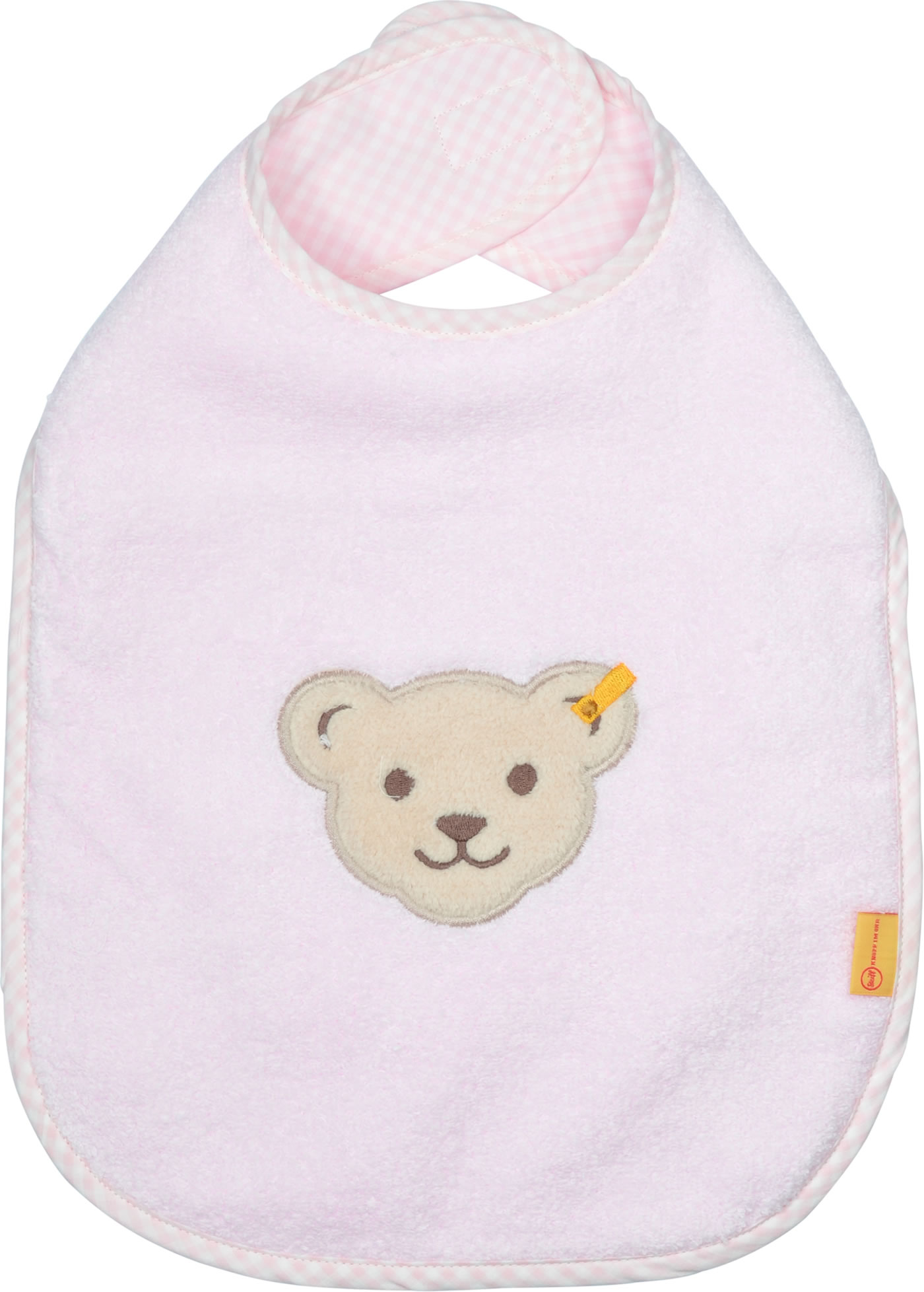 Niedliches Lätzchen mit Klettverschluss von STEIFF. Auf der Vorderseite befindet sich die STEIFF Plüsch-Bären-Applikation.