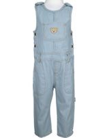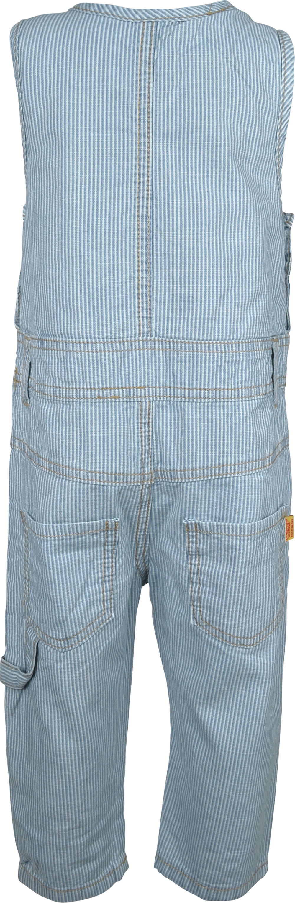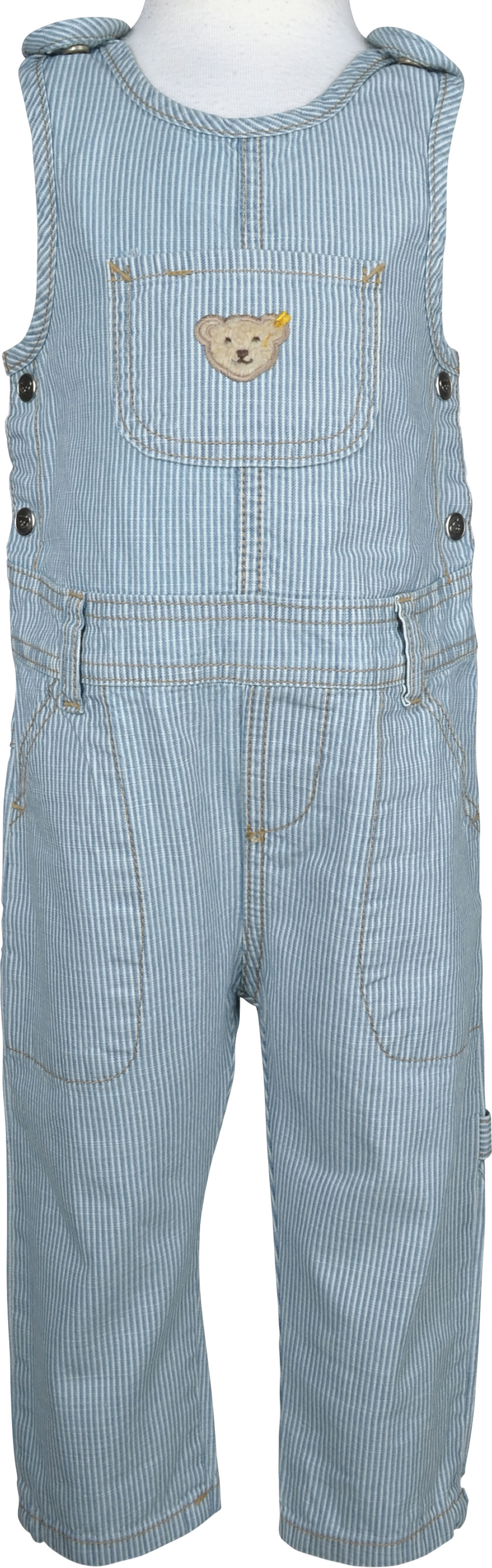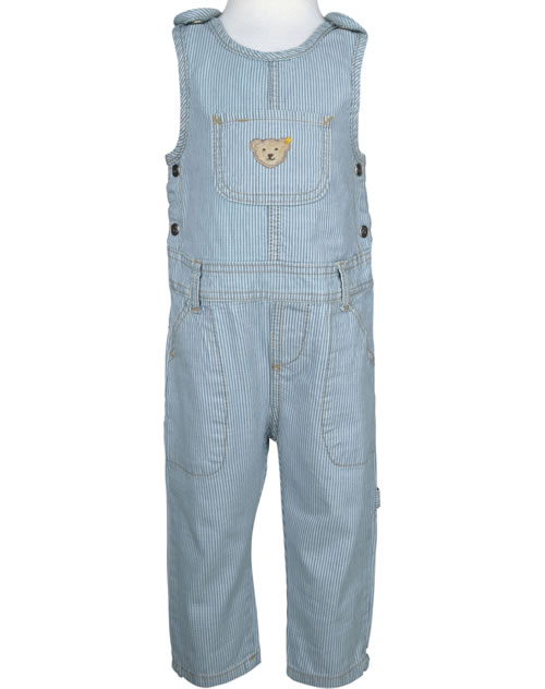 Jeans-Latzhose für Jungen in der Farbe stripe vertical aus der Little One-Kollektion von STEIFF. Auf der Vorderseite befinden sich zwei Einstecktaschen und auf der Rückseite zwei Gesäßtaschen. Der kleine STEIFF Bär befindet sich auf dem Latz. Seitlich an der Taille befinden sich ebenfalls Knöpfe.