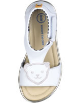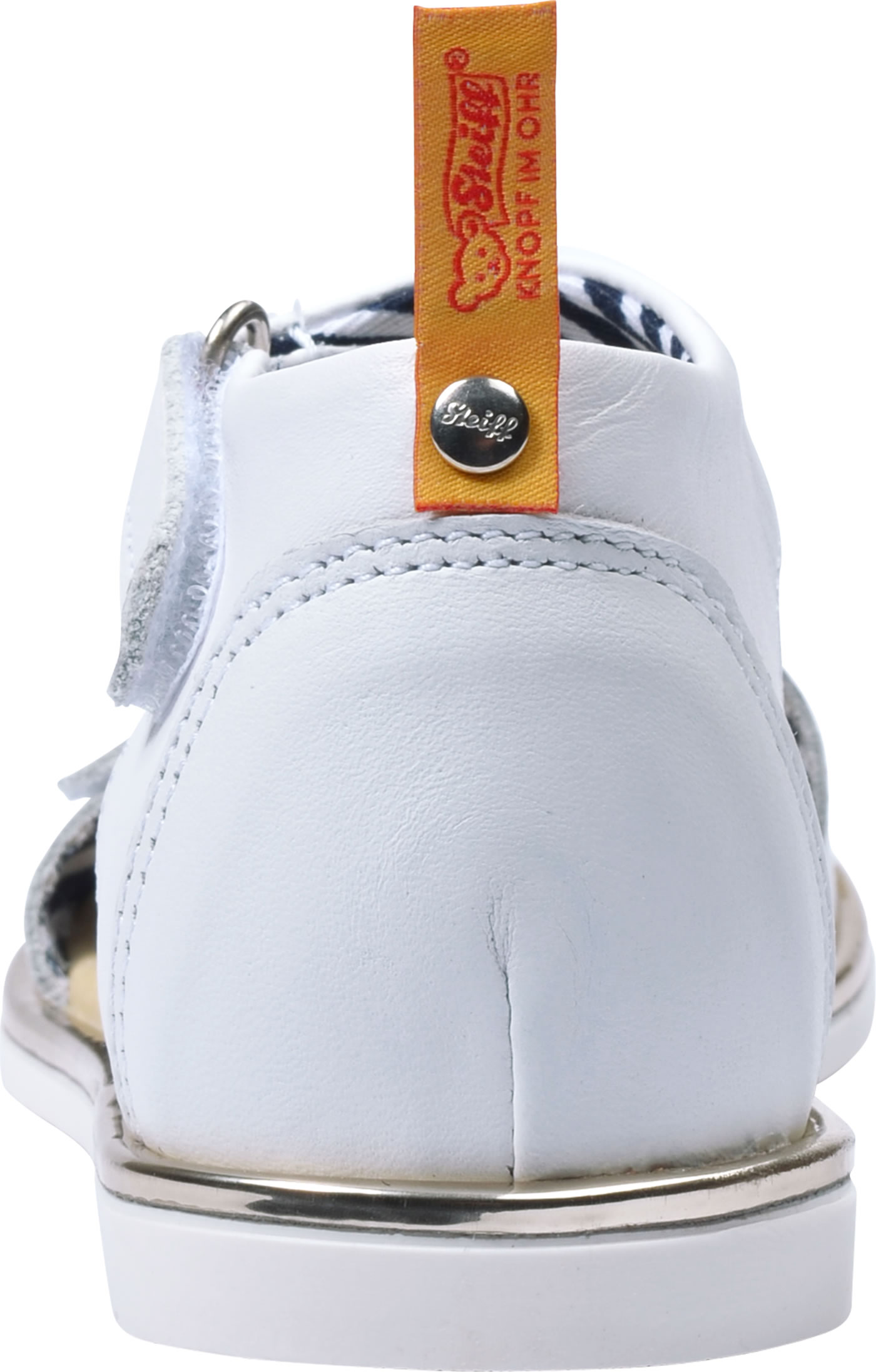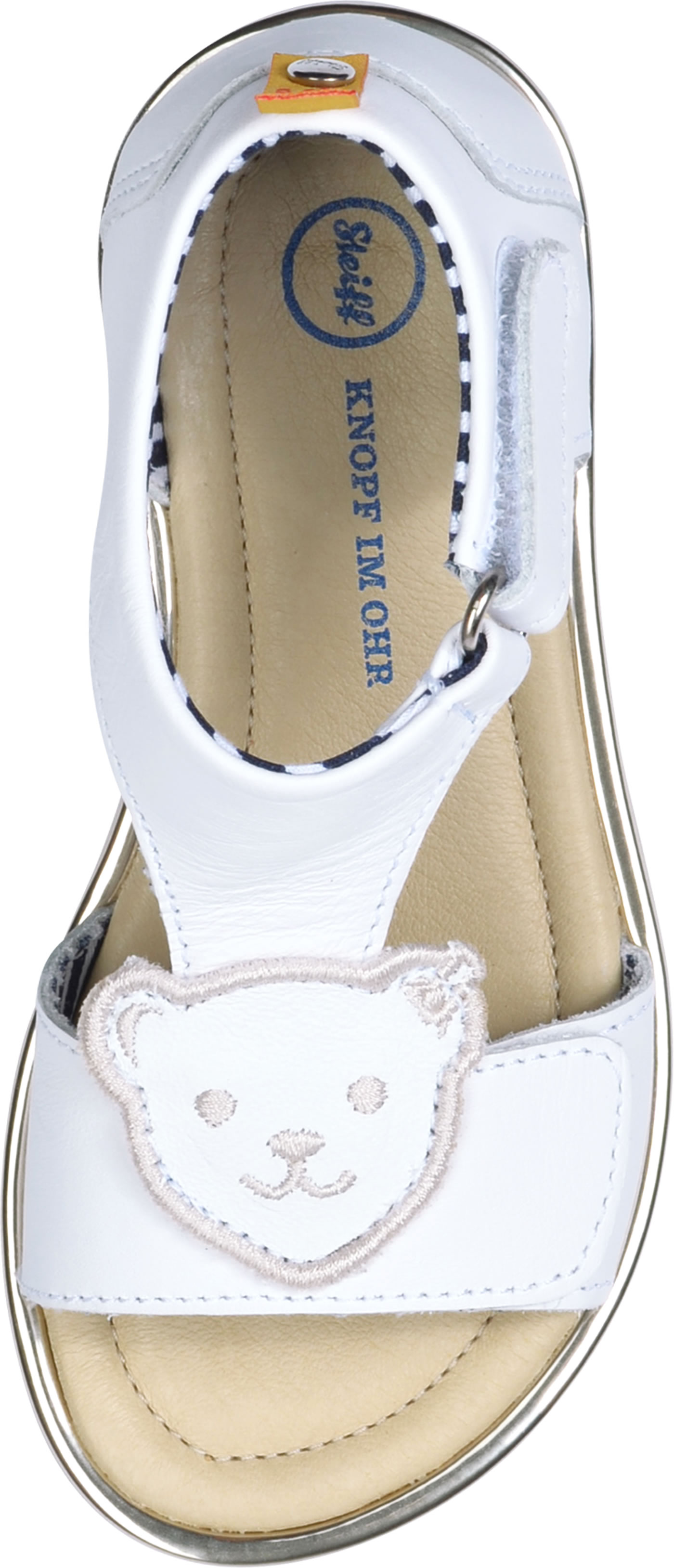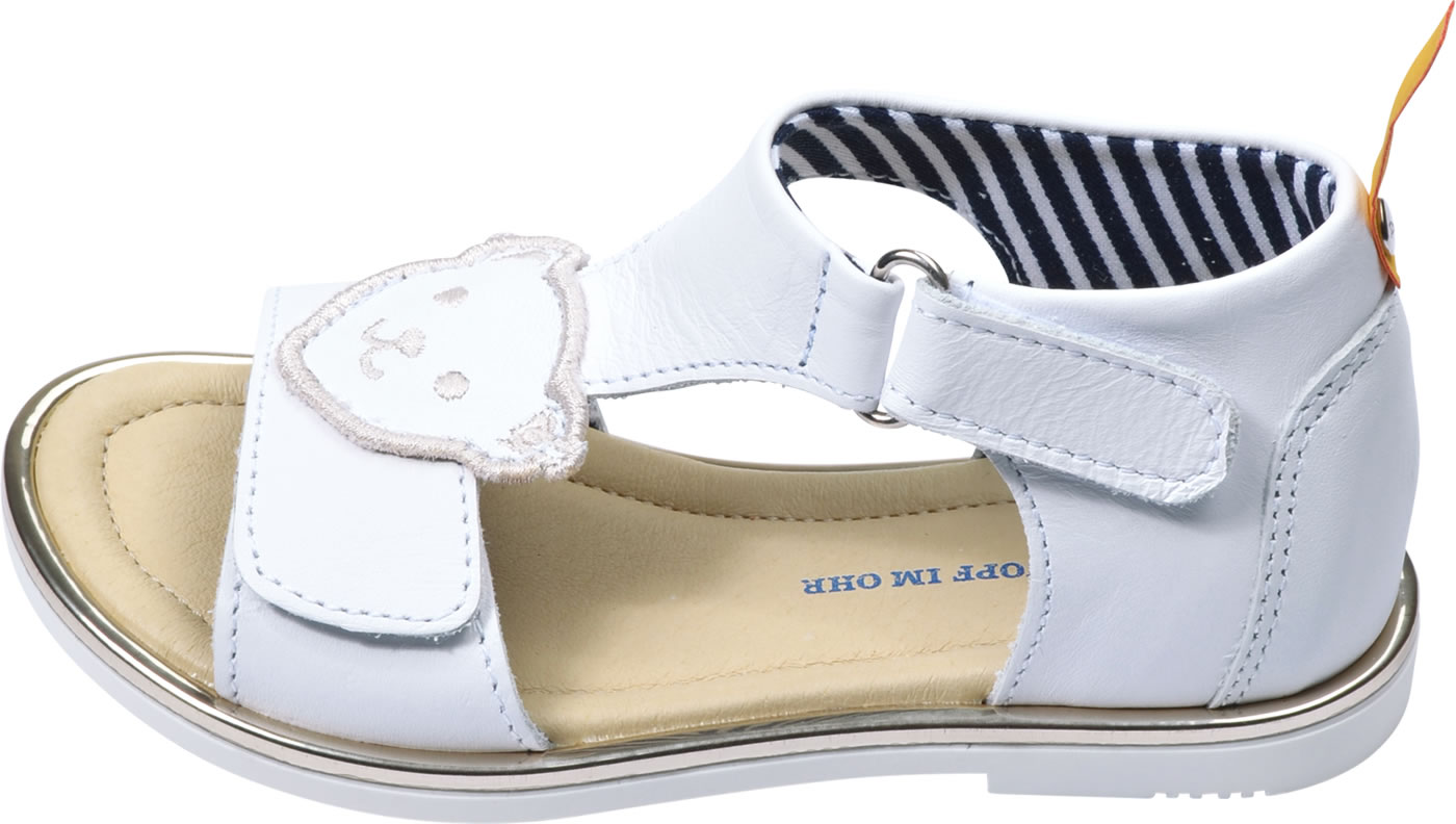 Hochwertige Leder-Sandale für Mädchen von STEIFF. Dank der beiden Klettverschlüsse läßt sich die Sandale individuell an den Kinderfuß anpassen. Besonders schöne Details sind der STEIFF Bär und die umlaufende goldfarbene Kante mit Glitzereffekt. Die weiche Sohle, außen aus Gummi und innen aus Leder, macht jede Bewegung mit und hat ein gutes Abrollverhalten.