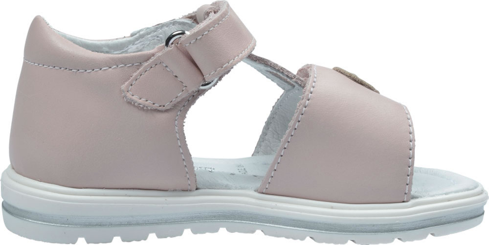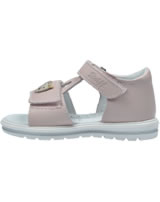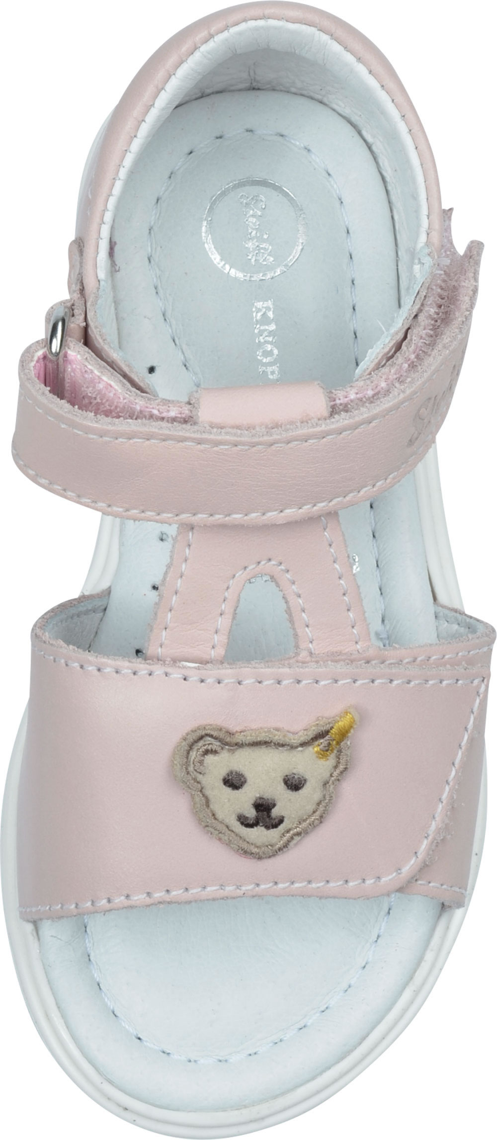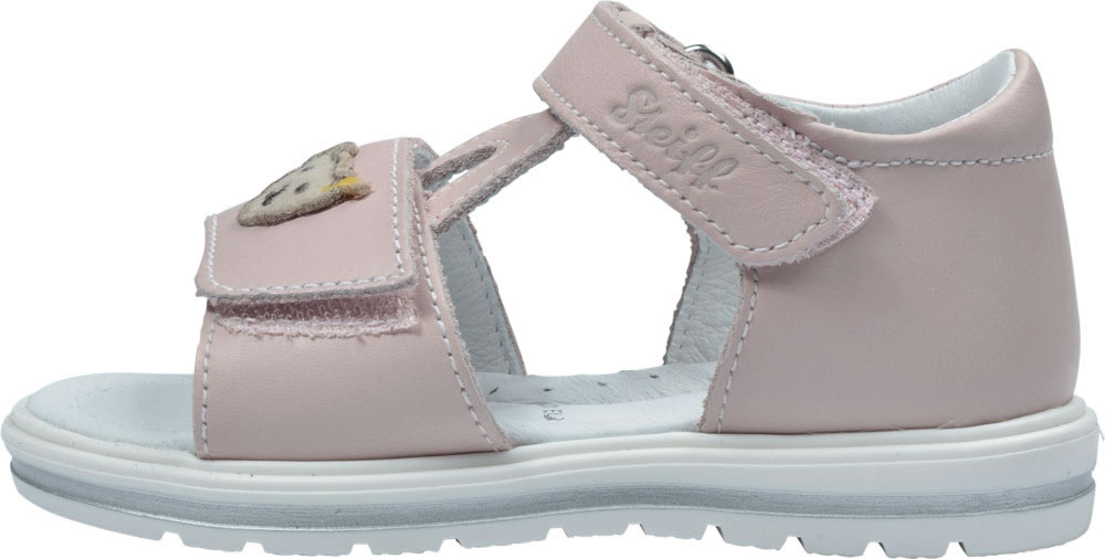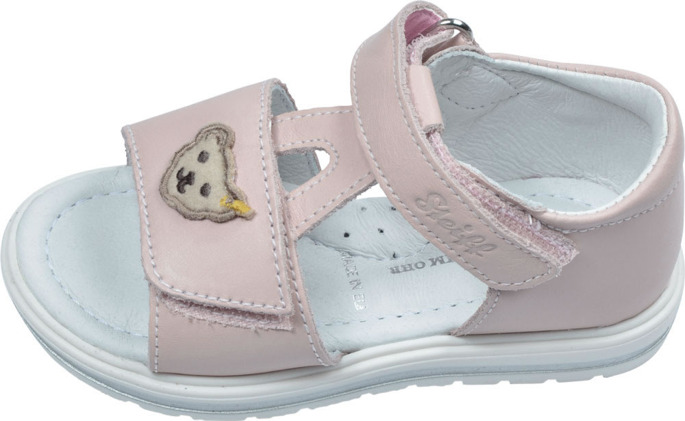 Hochwertige Leder Sandale mit Klettverschlüssen für Mädchen in rosa von STEIFF. Auf der Oberseite mit dem kleinen STEIFF Bären. Das weiche Leder verhindert Scheuerstellen. Die Nähte sind flach gearbeitet. Die Sohle besitzt ein weiches Fussbett.