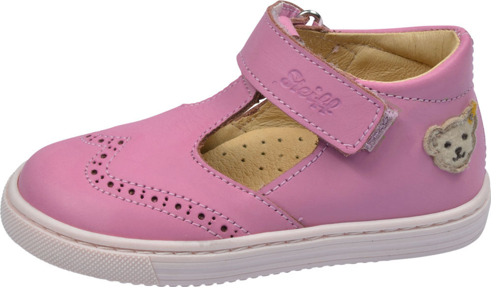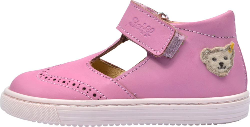 Hochwertige Leder-Sommer-Schuhe. Diese knöchelhohen Spangenschuhe für Mädchen in rosa von STEIFF sitzen dank Klettverschluß perfekt am Fuß und sind ideal für wärmere Tage. An der Seite mit dem kleinen STEIFF Bären, vorn mit hübschem Lochmuster. Mit herausnehmbarer Leder-Innensohle.